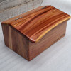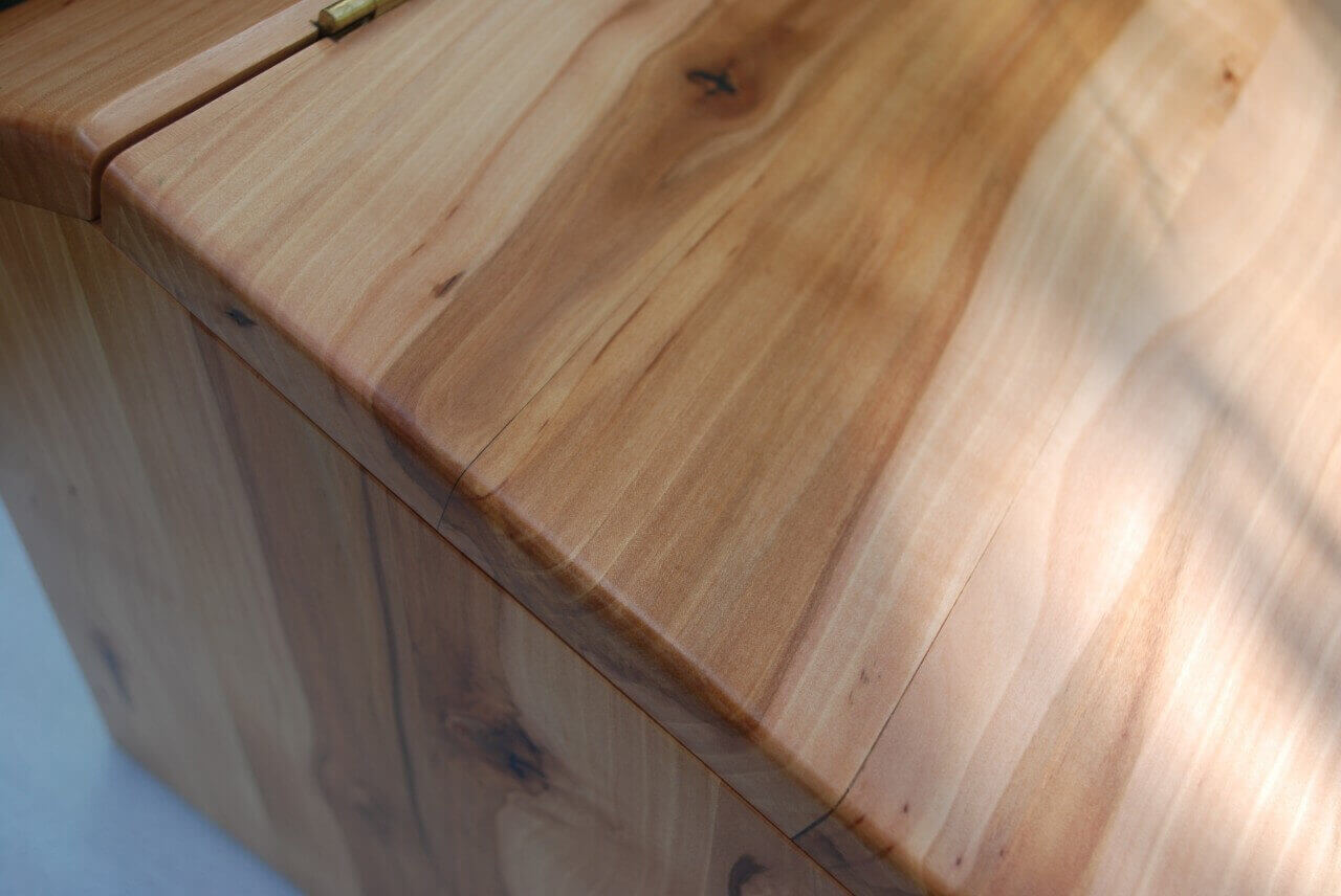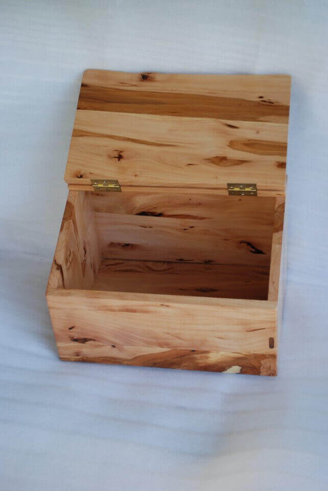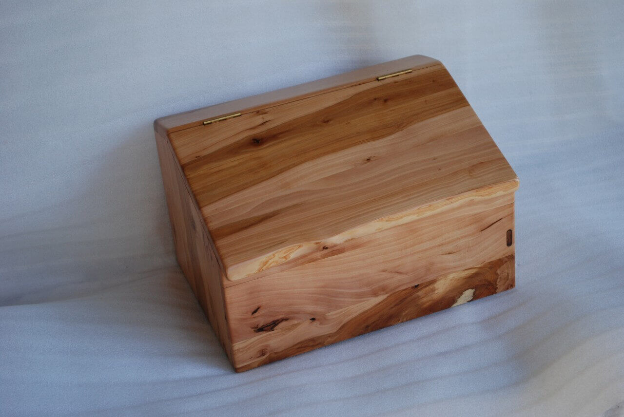 Bread container made of warm apple wood in fawn color with chocolate stripes. Curved at the edges. The edge of the flap of irregular shape. Finished with matte varnish. Also as a box for storing items, souvenirs.