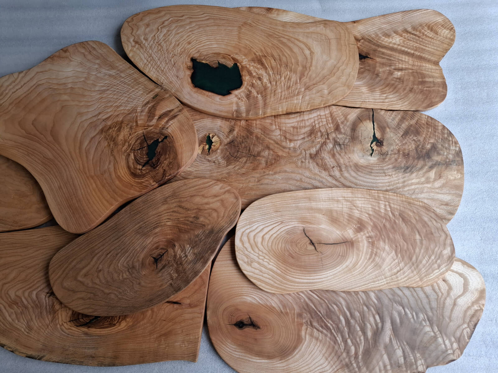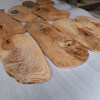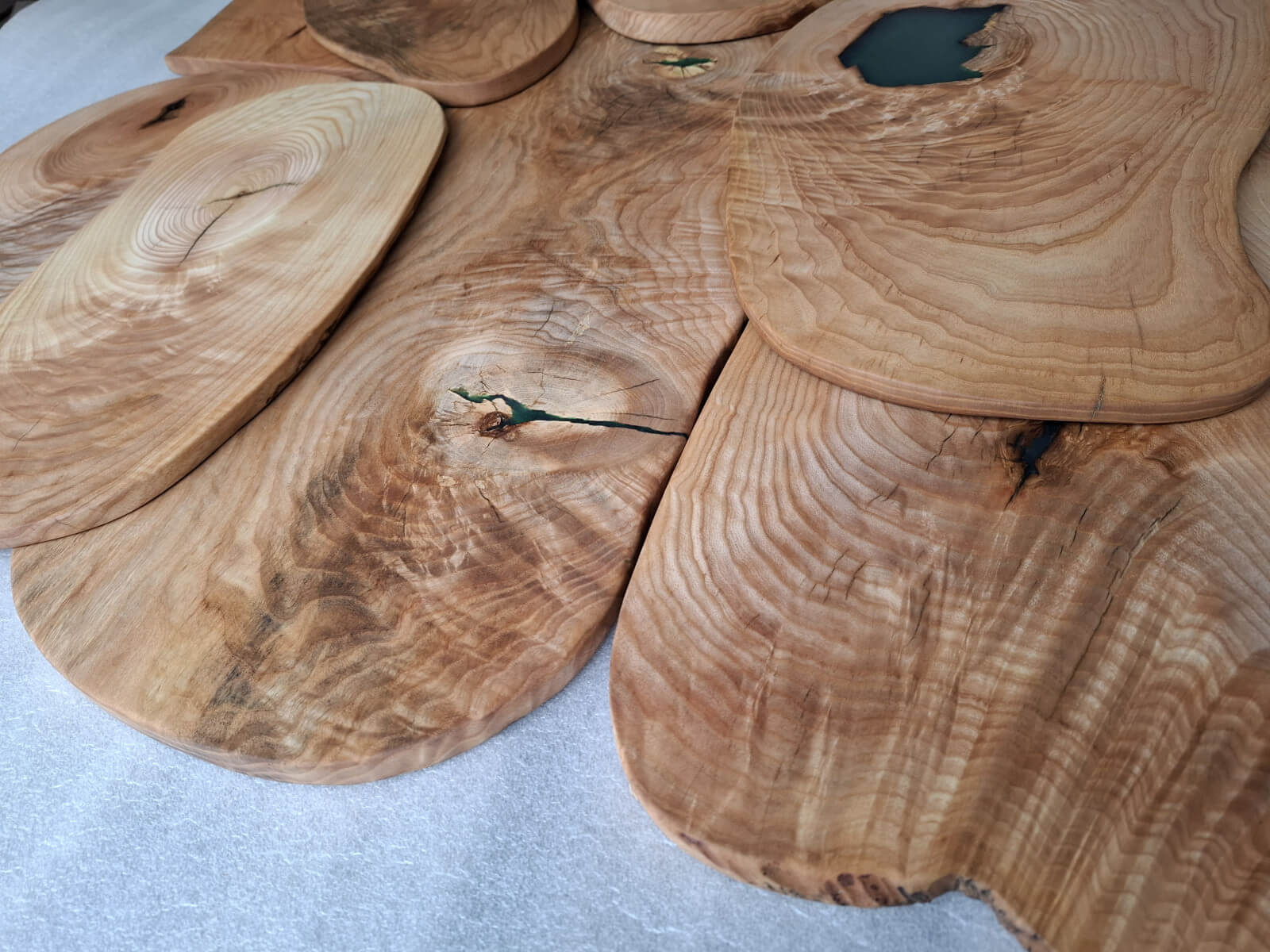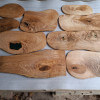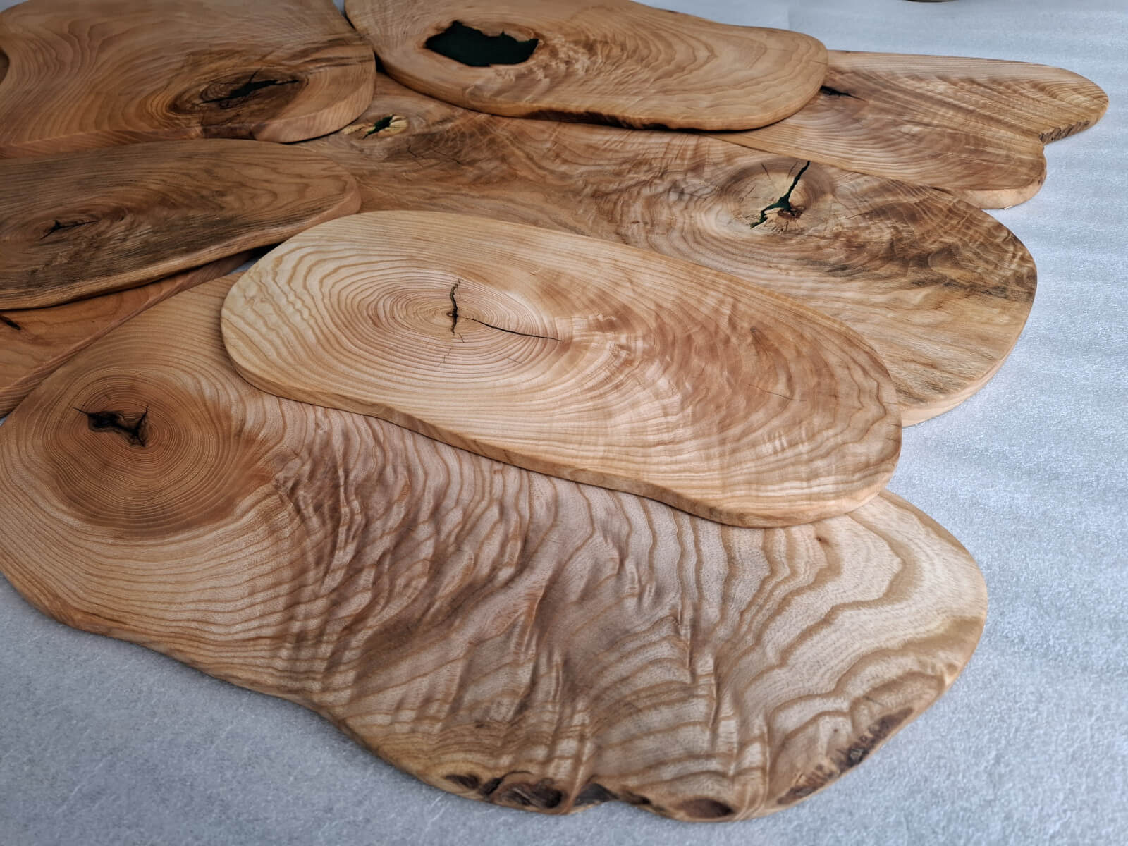 Serving trays made of ash with a distinct amount of so-called wavy grain around large knots, actually almost slices, irregular oval shapes, natural edges, protected with natural linseed oil.