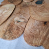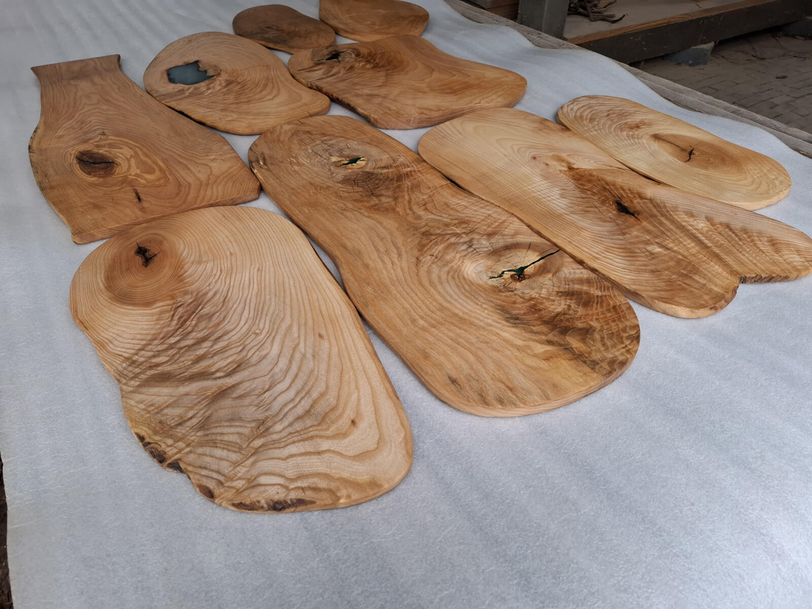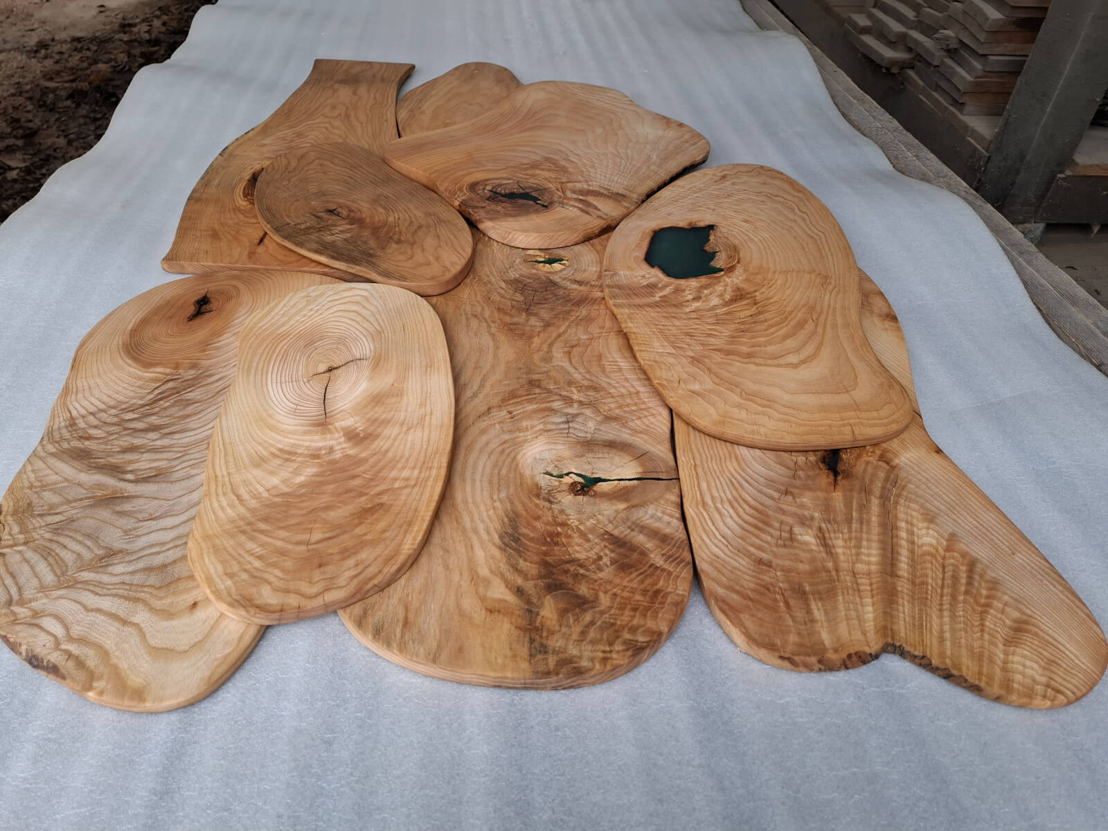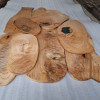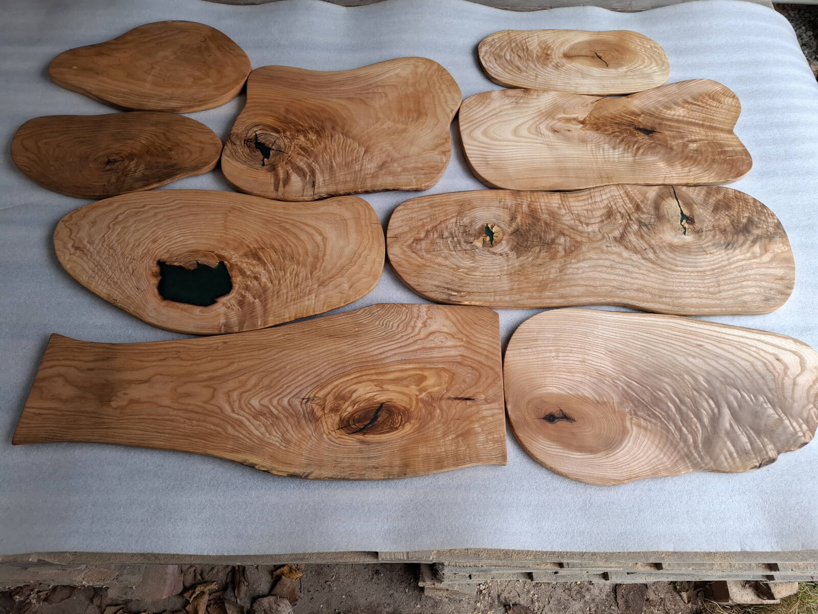 Serving trays made of ash with a distinct amount of so-called wavy grain around large knots, actually almost slices, irregular oval shapes, natural edges, protected with natural linseed oil.