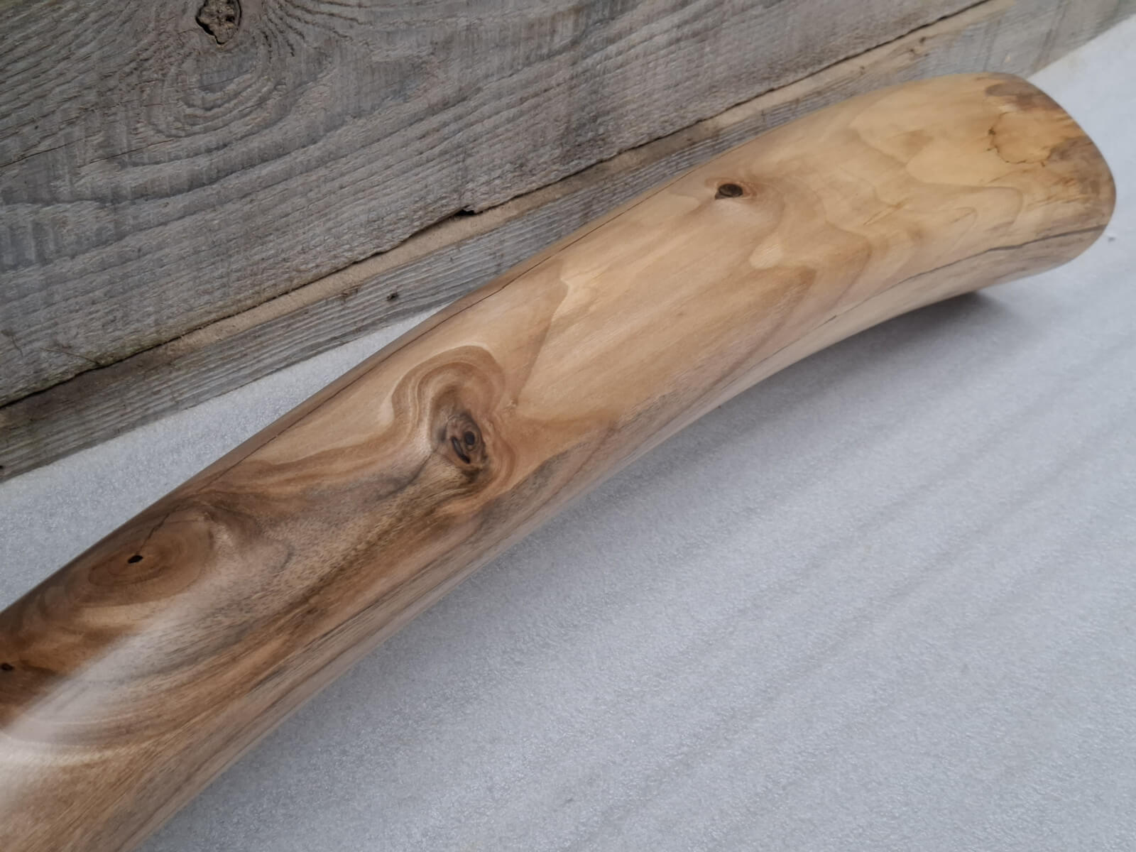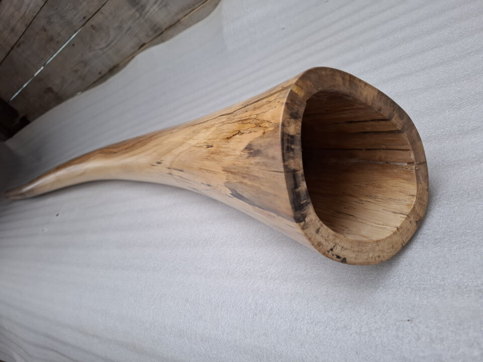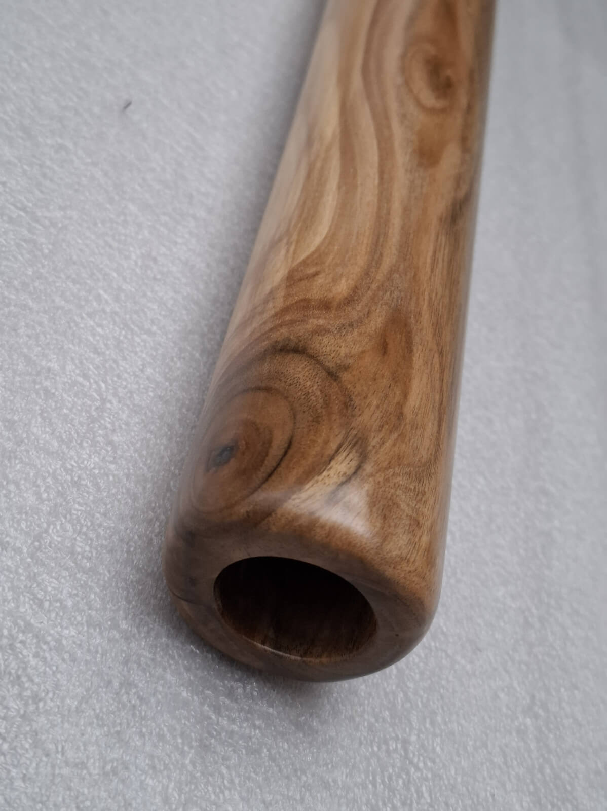 Didgeridoo made of walnut wood. Length 186 cm, bell diameter 15 cm, wall thickness 16/11mm, Tone C#/D, natural walnut wood color, matte varnish on the outside, damar and beeswax mixture on the inside. Mouthpiece profiled from wood, inner diameter 3cm.
