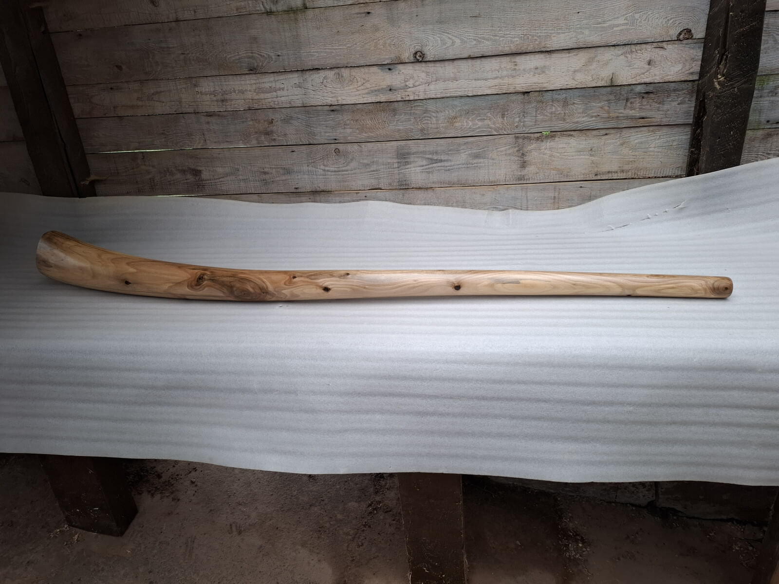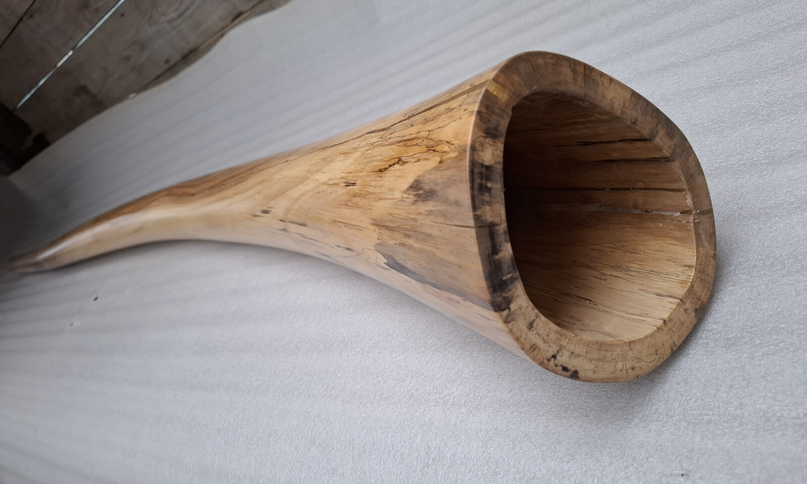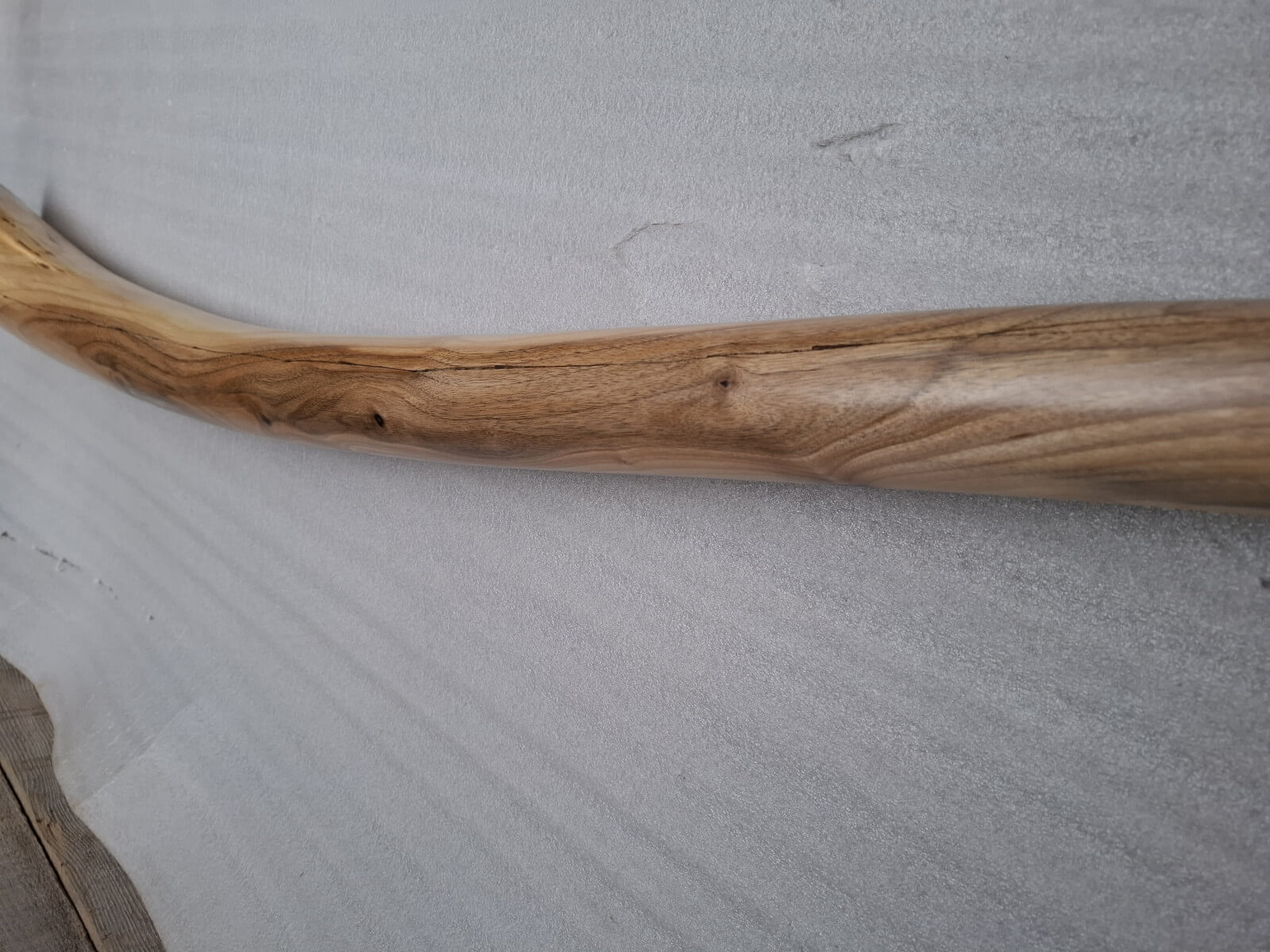 Didgeridoo made of walnut wood. Length 186 cm, bell diameter 15 cm, wall thickness 16/11mm, Tone C#/D, natural walnut wood color, matte varnish on the outside, damar and beeswax mixture on the inside. Mouthpiece profiled from wood, inner diameter 3cm.