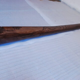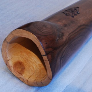 Meditative didgeridoo from ash tree. Length 195 cm, bell diameter 18 cm, wall thickness 1.2-1.5 cm, Key C. Chocolate brown, matt varnish on the outside, damara and beeswax mixture on the inside.