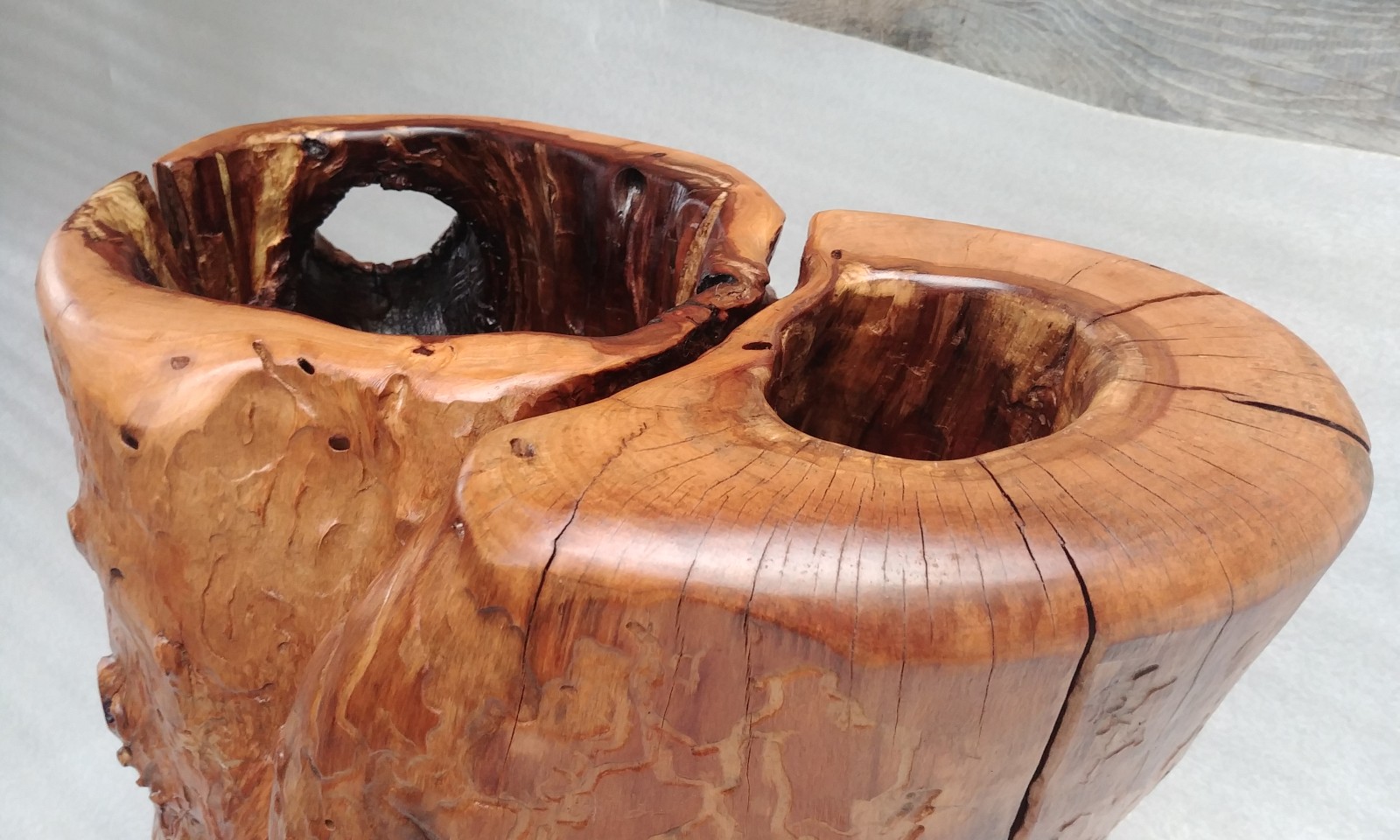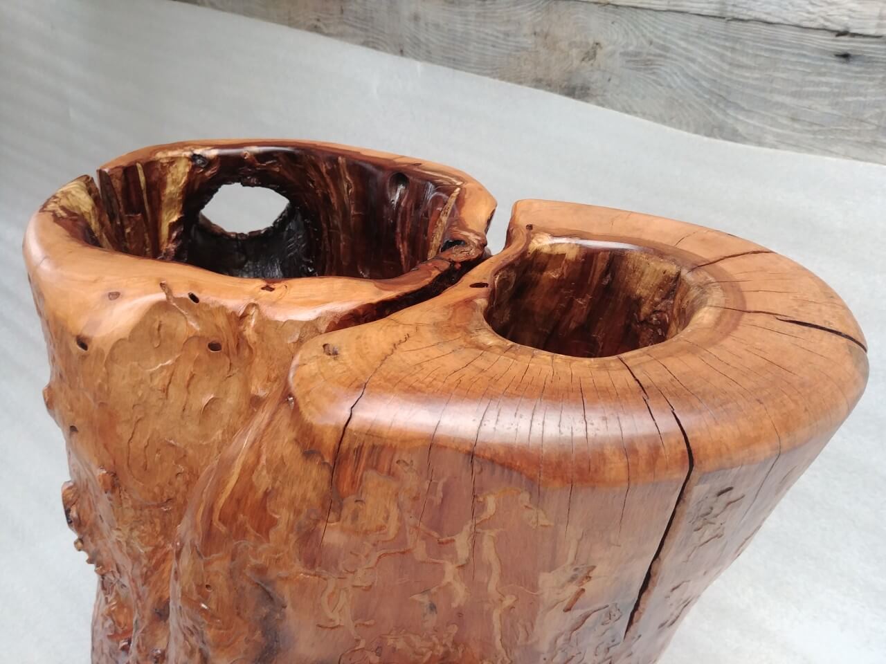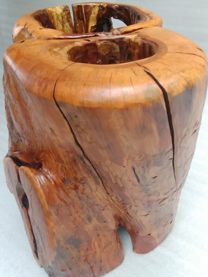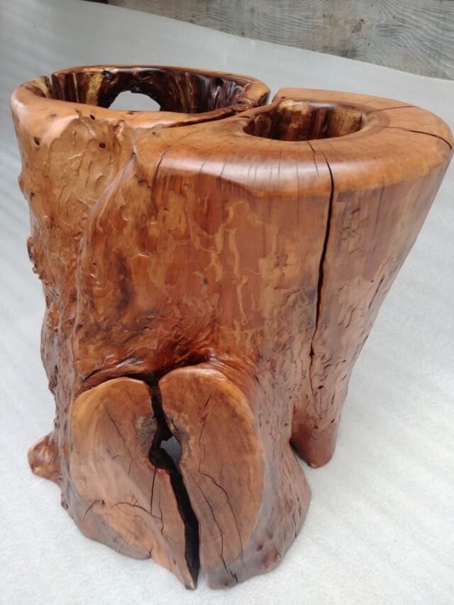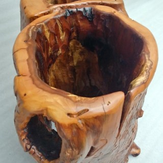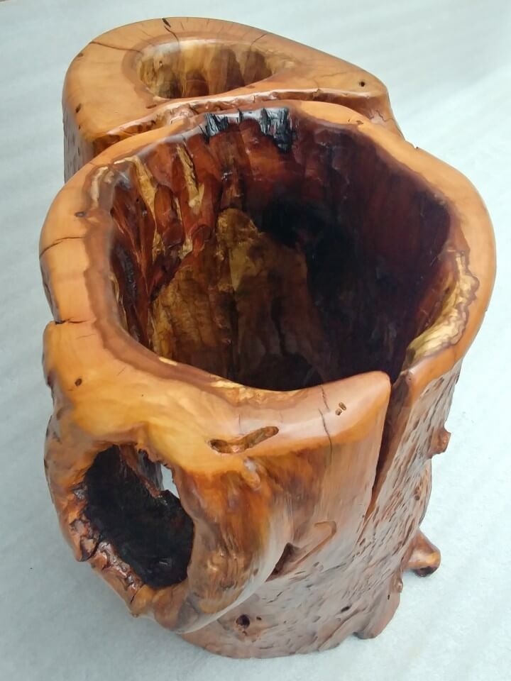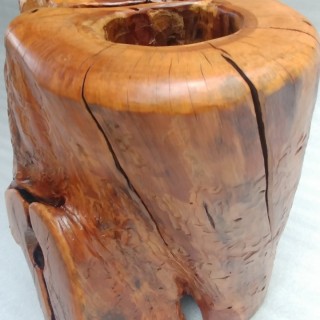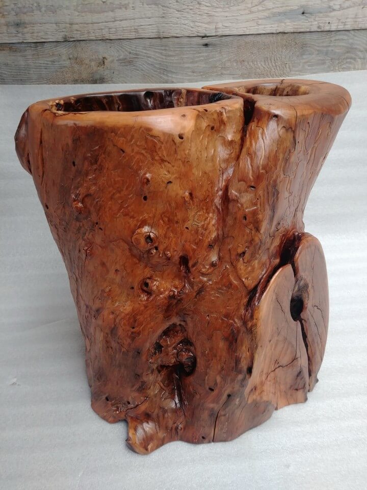 A flowerpot cover made of an apple tree trunk hollowed out by ants, finished with a chisel on the inside, on the outside the natural surface, brushed with interesting patterns left by woodworms, matte lacquer.