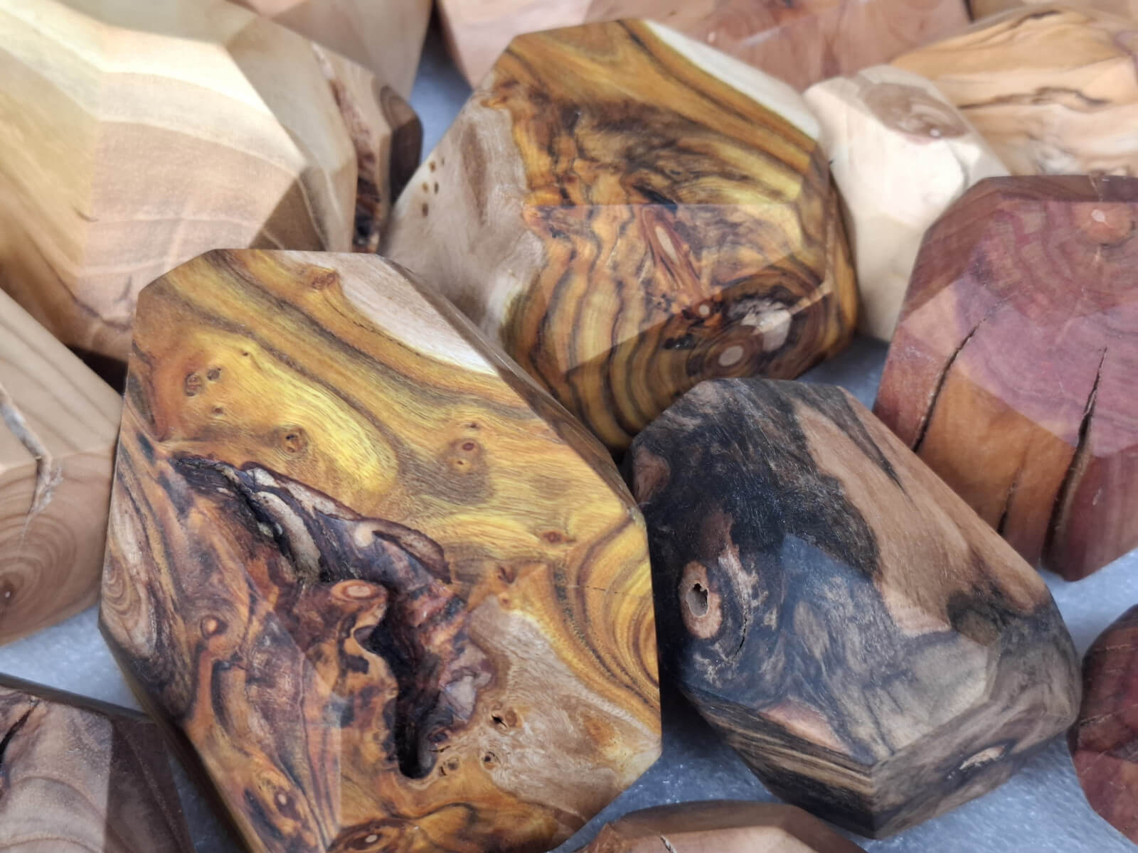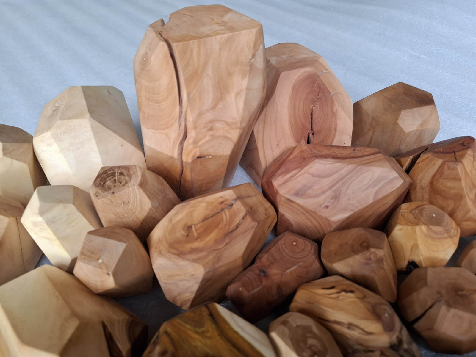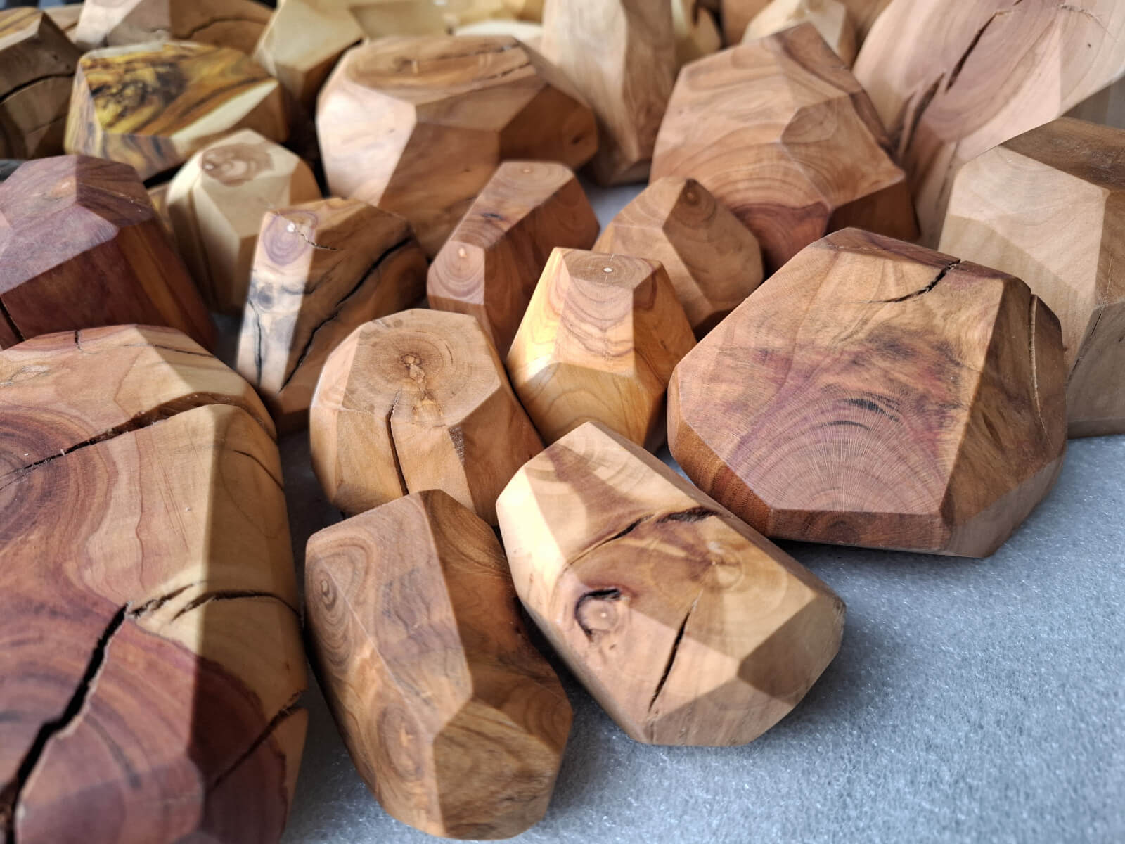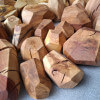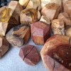 Polygonal nuggets made of knotted branch fragments of various tree species, including oak, walnut, ash, larch, robinia, cherry, elm, tuja, plum, apple, catalpa, black oak, maple, lilac. Surface sanded and oiled. As decoration or blocks for stacking jenga type towers.