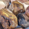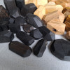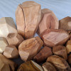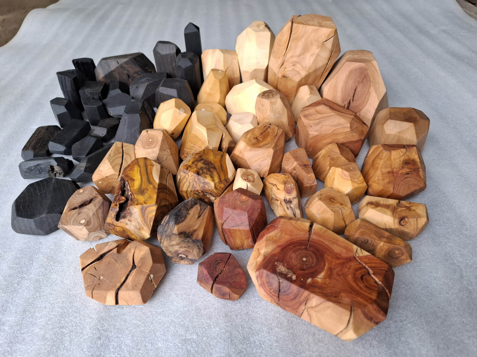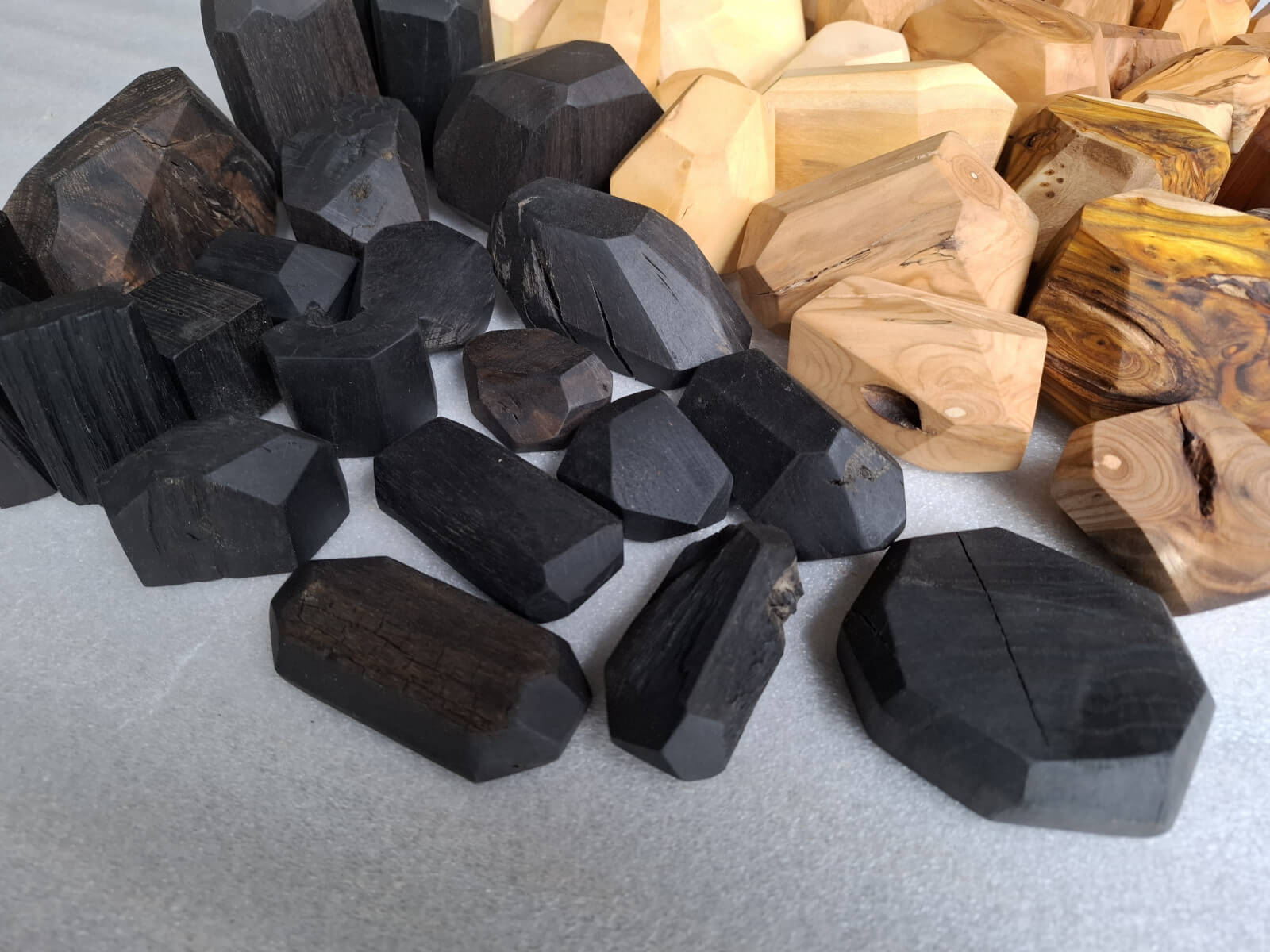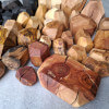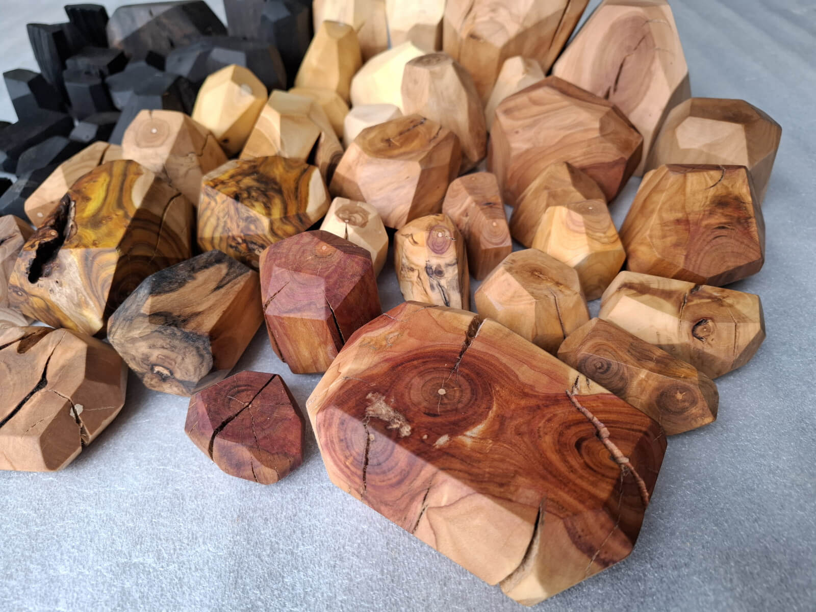 Polygonal nuggets made of knotted branch fragments of various tree species, including oak, walnut, ash, larch, robinia, cherry, elm, tuja, plum, apple, catalpa, black oak, maple, lilac. Surface sanded and oiled. As decoration or blocks for stacking jenga type towers.