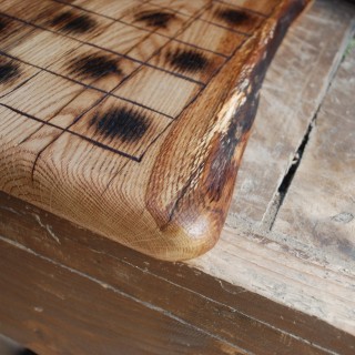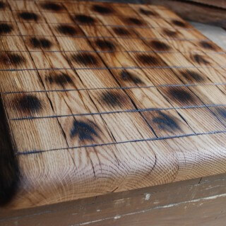 Checkers board made of Oak planks, rounded natural edges, dark burned areas, brushed surface, matte varnish. Dimensions 35 x 35 cm.
