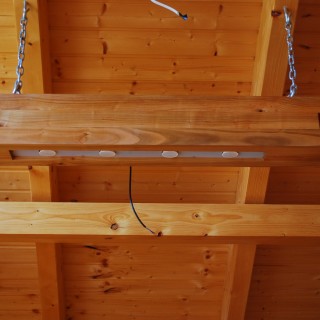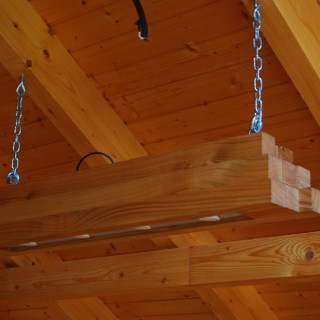 Ceiling lamps made of a bundle of 9 pieces of 6 x 6 cm square timber, cut to different lengths. Heavy, hung on two chains, led bulbs, bottom cover made of opal plexiglass, length about 100 cm.
