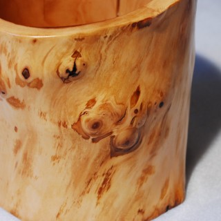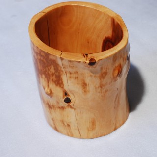 A decorative container for utensils made of an apple-tree trunk, previously hollowed out naturally by ants, carved and rounded. Wood polished and matt varnished in a natural color.