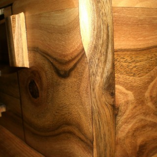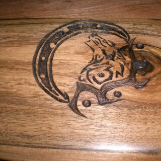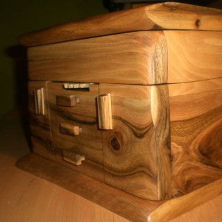 Jewelery box made of 100% Walnut wood. Mirror in the upper flap and under it 2 side jewelry compartments and a central glass compartment with a traditional music box mechanism. Two side doors with necklaces / earrings and three jewelry drawers below. The music box is wound by 2 wooden gears and stopped by lowering the flap. Carved tribal motif on the flip and Melody - a lullaby chosen by the customer. Smoothly curved shapes. The casket is solid and heavy for its dimensions.
