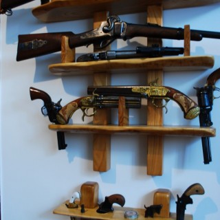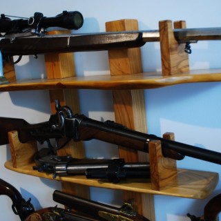 Wall shelf made of cherry wood, for displaying a collection of black powder weapons. Color and front edges natural, varnished.