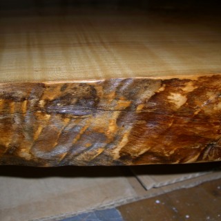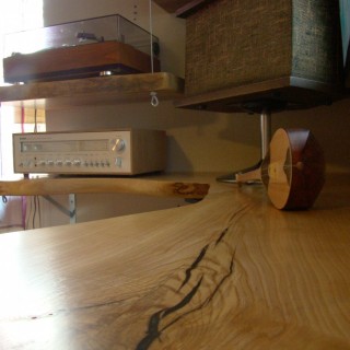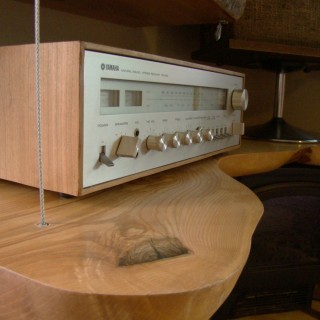 Massive half-hanging housing made of Ash logs, 55 mm thick, for high-class retro Hi-Fi equipment. Bottom top of the L-shaped shelf with dimensions of 160 x 130 cm, 30-50 cm wide. Top shelves 70 x 30-40 cm. Edges partly homogeneous and partly curvilinear to the required shape. Natural wood colors from straw, salmon to brown. All knots, cracks and natural cavities polished and filled with resin. All matt varnished.