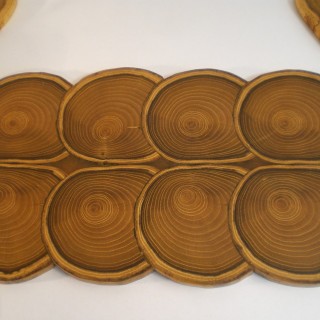Stylish and original Table Set composed of round wood edges of Robinia Acacia in a natural style. Includes 1 large stand for a hot dish, 5 small stands for mugs / cups, sugar bowl and salt shaker. The natural dark brown-green color of the hard part of the trunk in cross-section contrasts with the bright part of white creating an interesting wood pattern. The whole is protected with linseed oil.