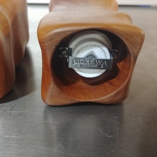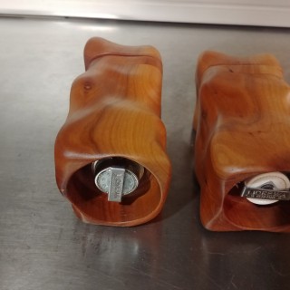 Pepper mills carved in plum wood, in rounded curvilinear shapes. A high-quality grinder mechanism from Lidrew.
