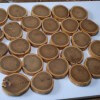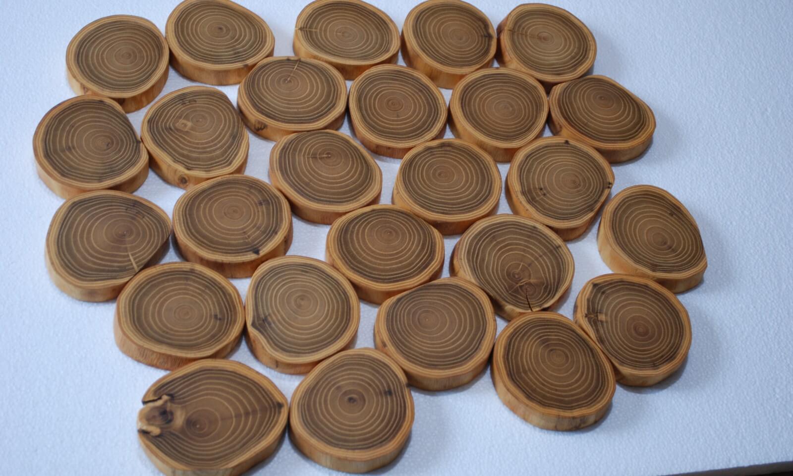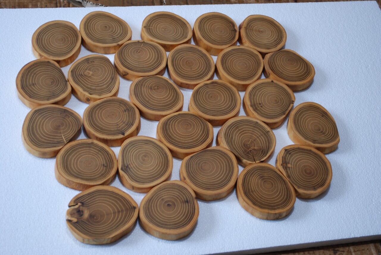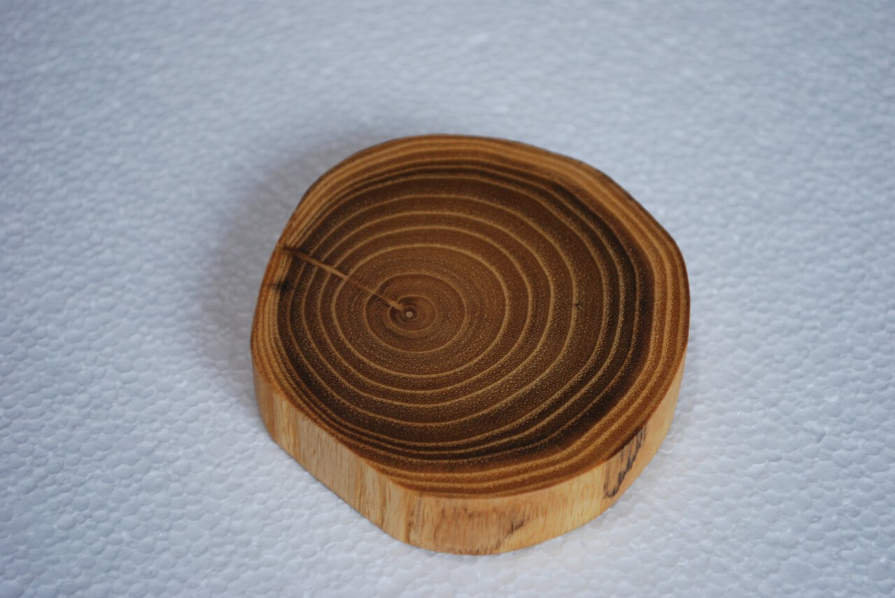 Coasters for a cup made of Robinia Acacia stump slices about 9 cm in diameter, polished and soaked in natural linseed oil.