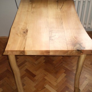 A heavy, massive kitchen table. A thick, 5cm top made of ash logs with two unedged sides. A hand-joined frame made of a dovetail connection, attached to the table top on wooden pegs. Legs made of oak branches in which the frame is recessed. The whole will not move.
