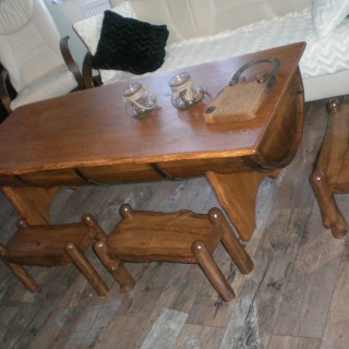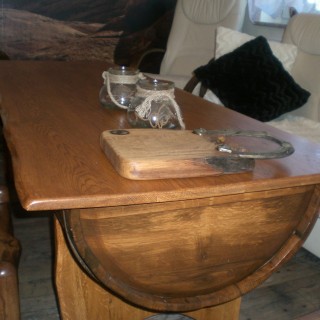 Solid and heavy 2-meter oak bench made on the basis of an old barrel, also oak, assembled along the length of two halves. Unedged edges of table top and brackets, medium oak color.