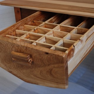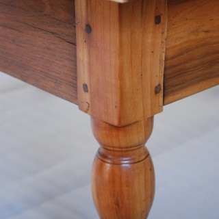 A retro-style bench after renovation, an elm top and a thuja drawer. Oak frame, original cherry legs.