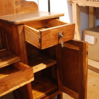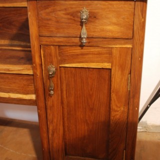 Pre-war Dąbowa Dressing Table, after renovation. Made according to traditional carpentry techniques, completely by hand. Cleaned and varnished on mat, mirror and new fittings. The color of dark oak is natural, resulting from aging of the wood, visible bright bands of white oak.