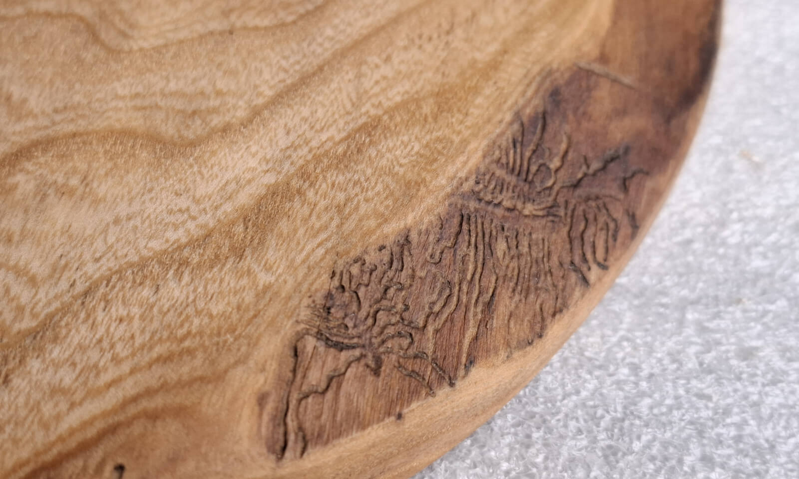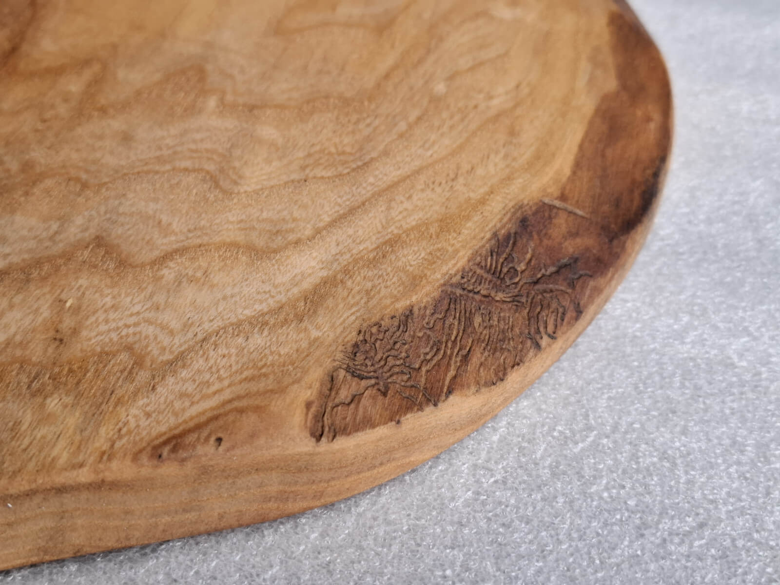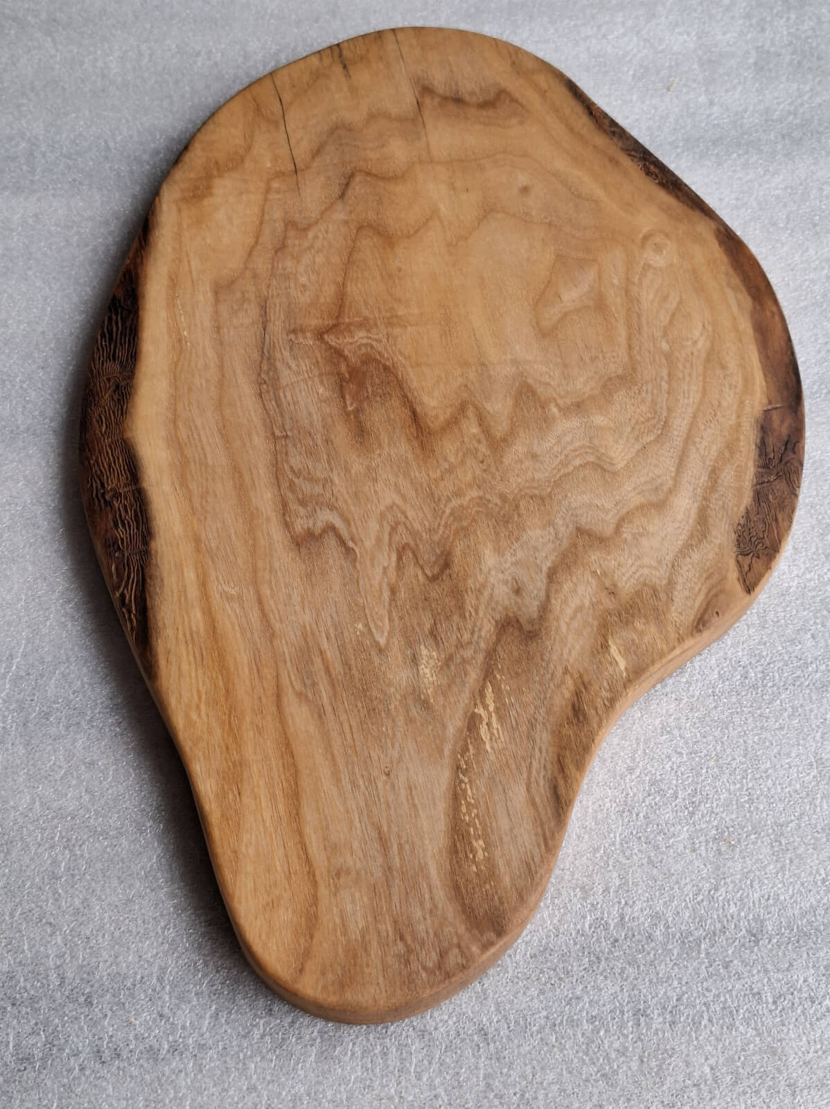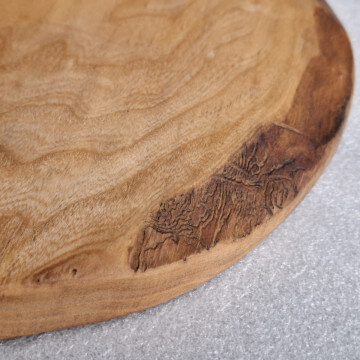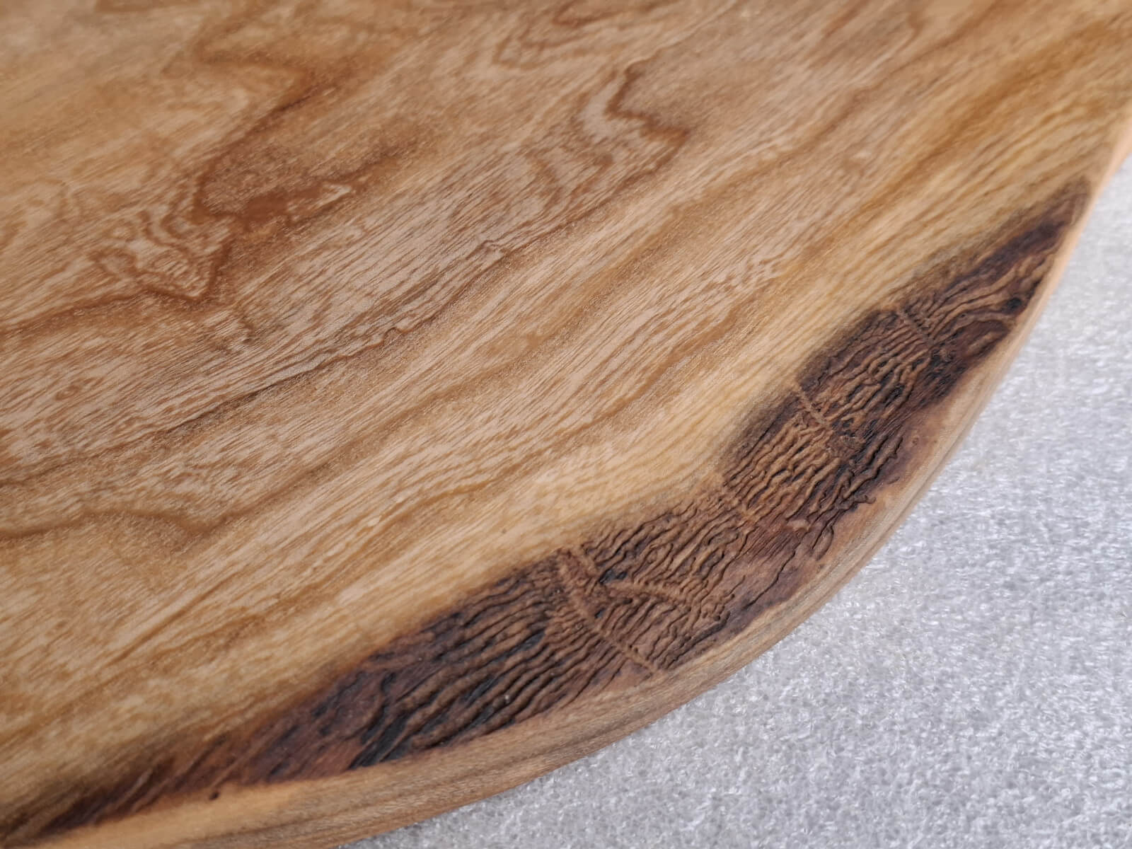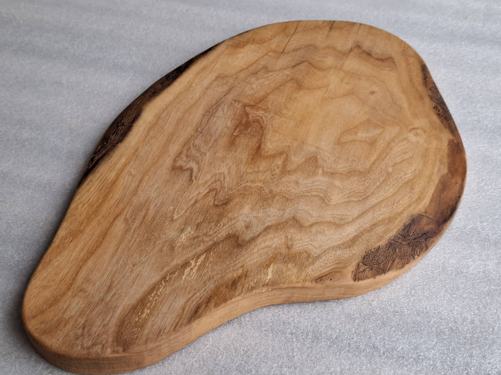 Kitchen board made of ash wood, 20 mm thick, oval shape, live edge, soaked in natural linseed oil.
