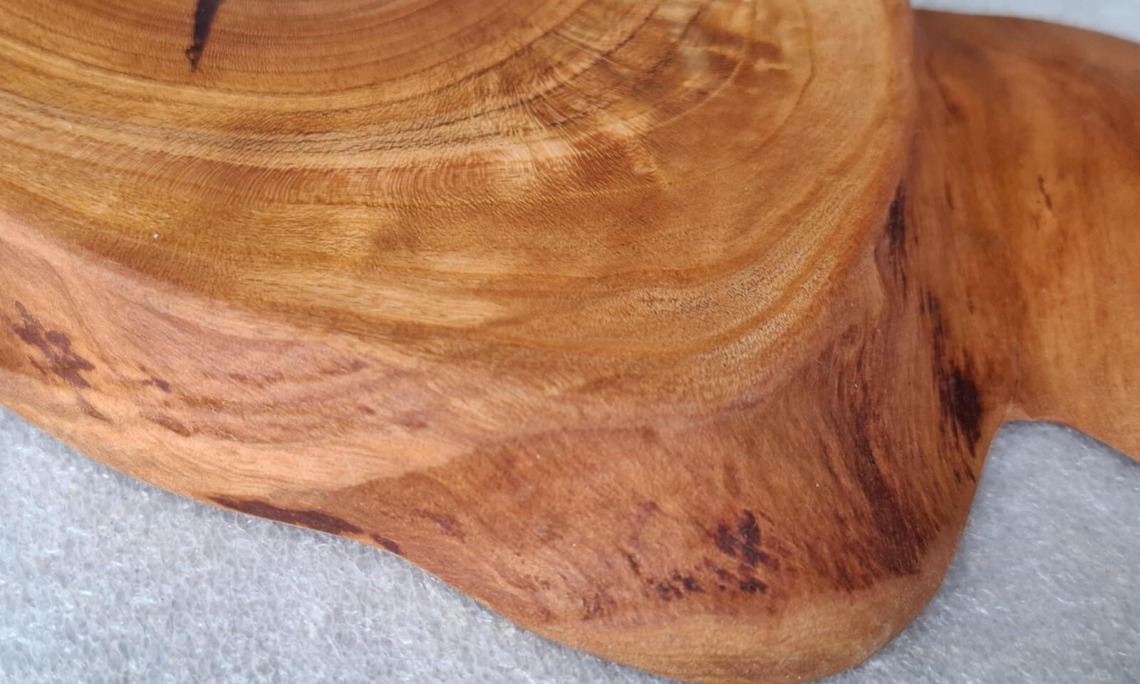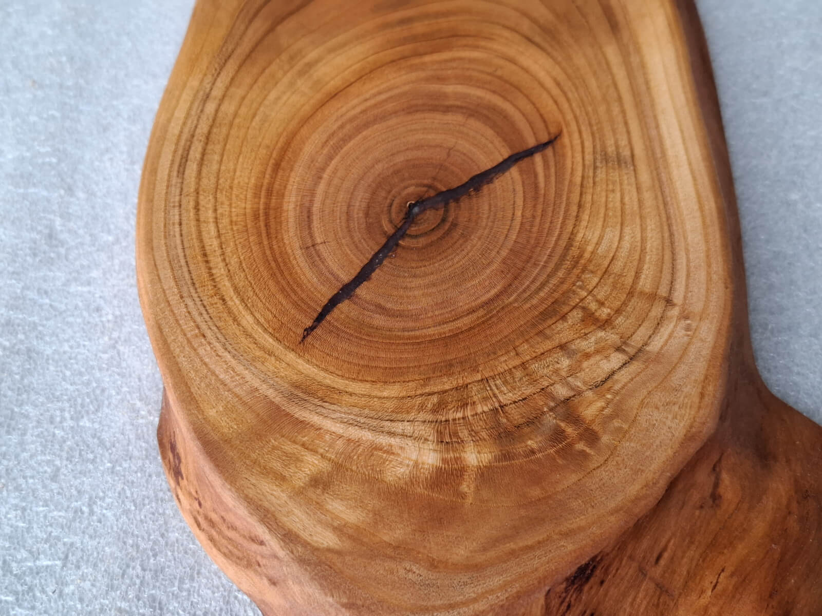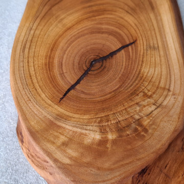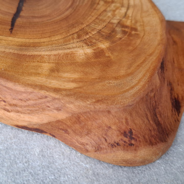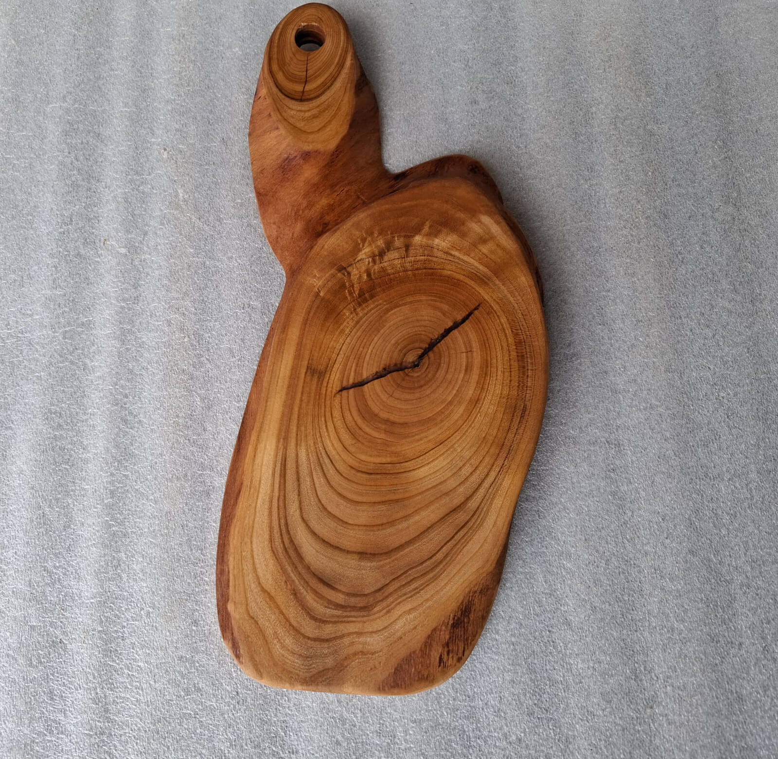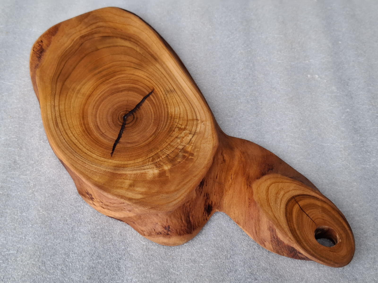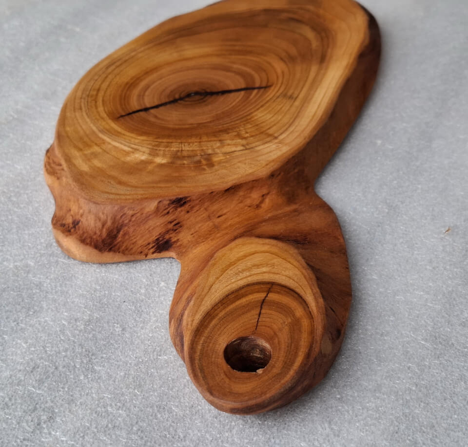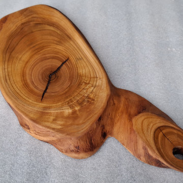 Kitchen board made of cherry wood 15 mm thick, oval shape, with a handle, soaked in natural linseed oil.