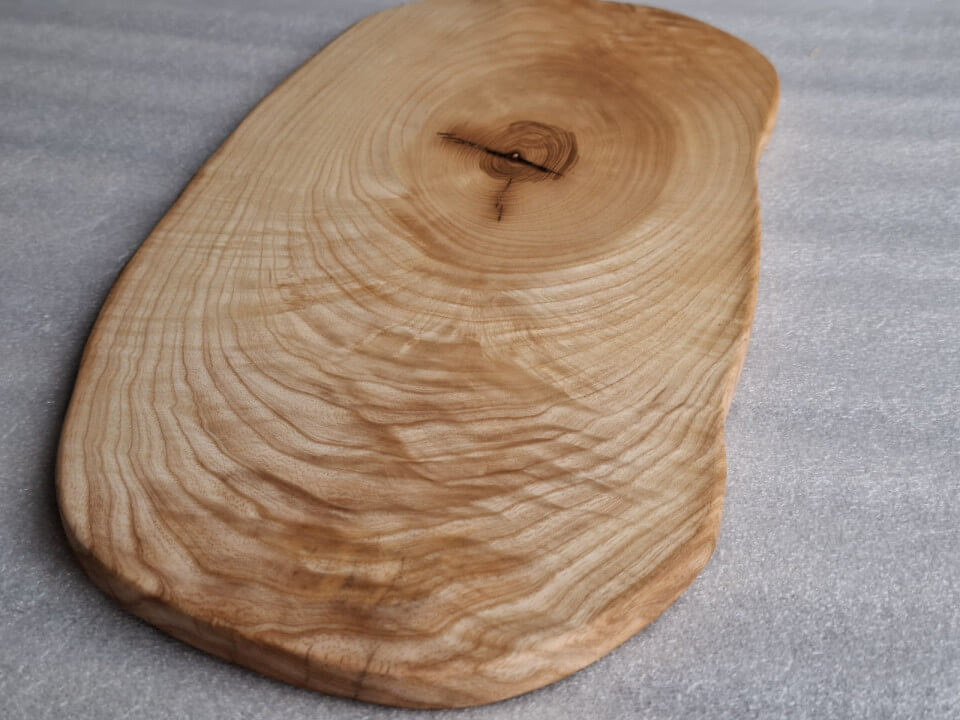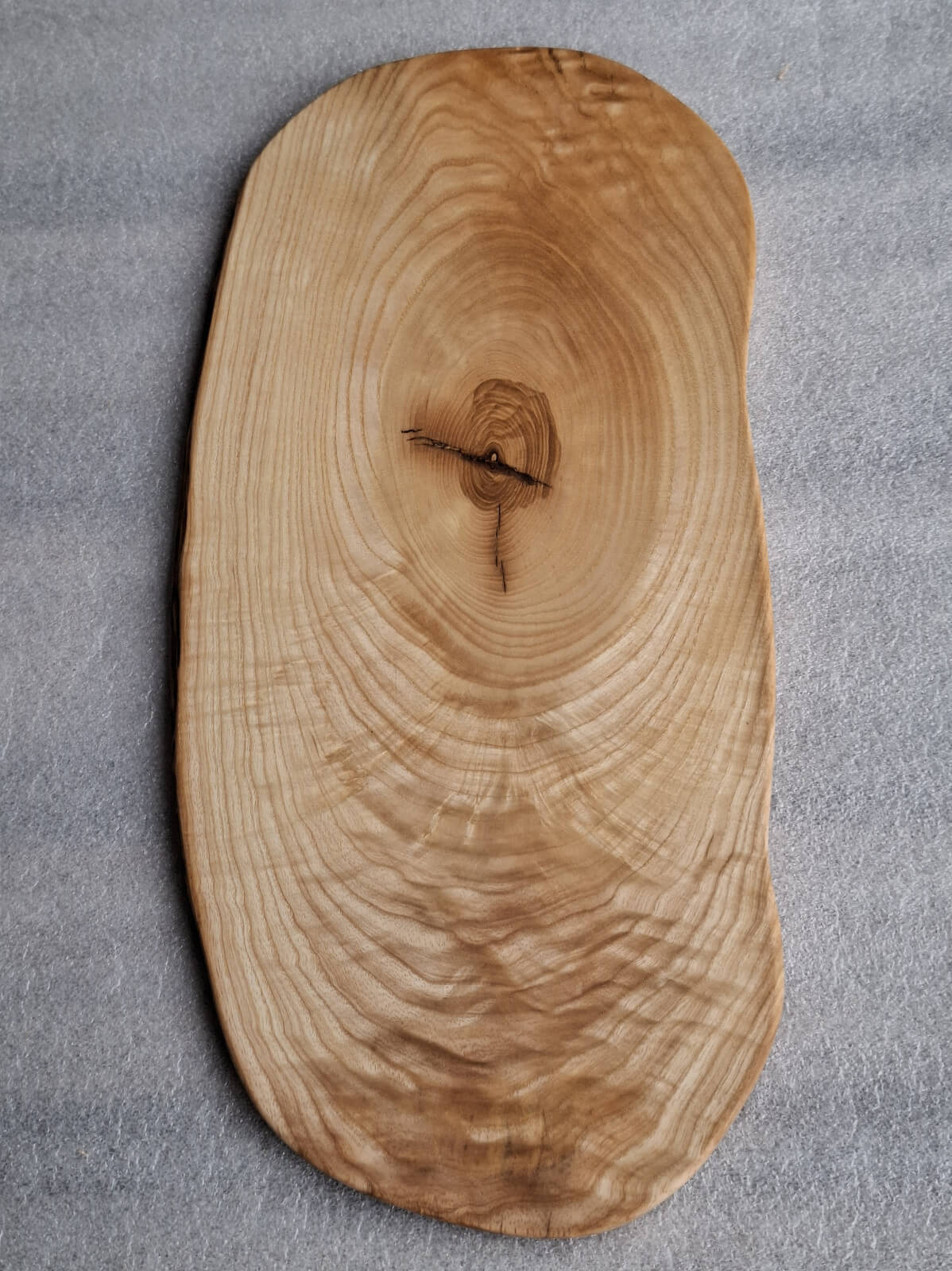 Kitchen board, serving tray made of Ash wood 15 mm thick, oval shape, live edge, soaked in natural linseed oil.