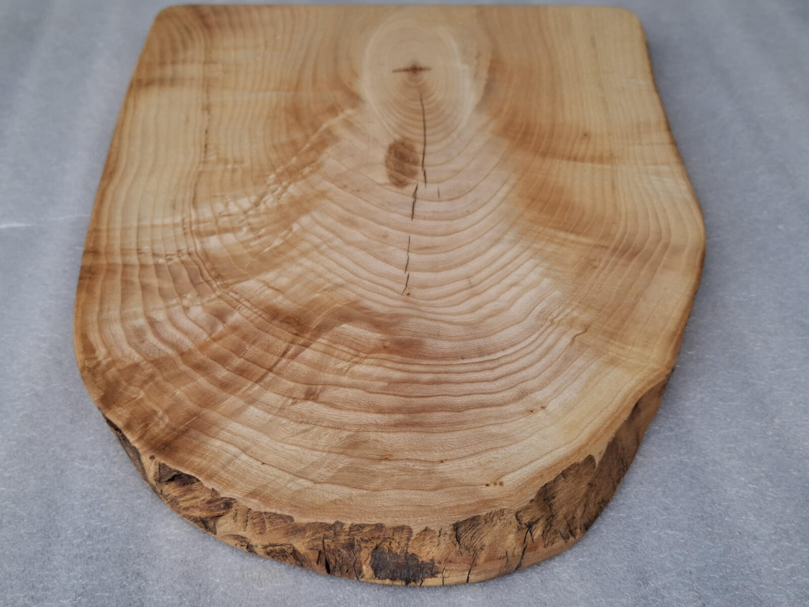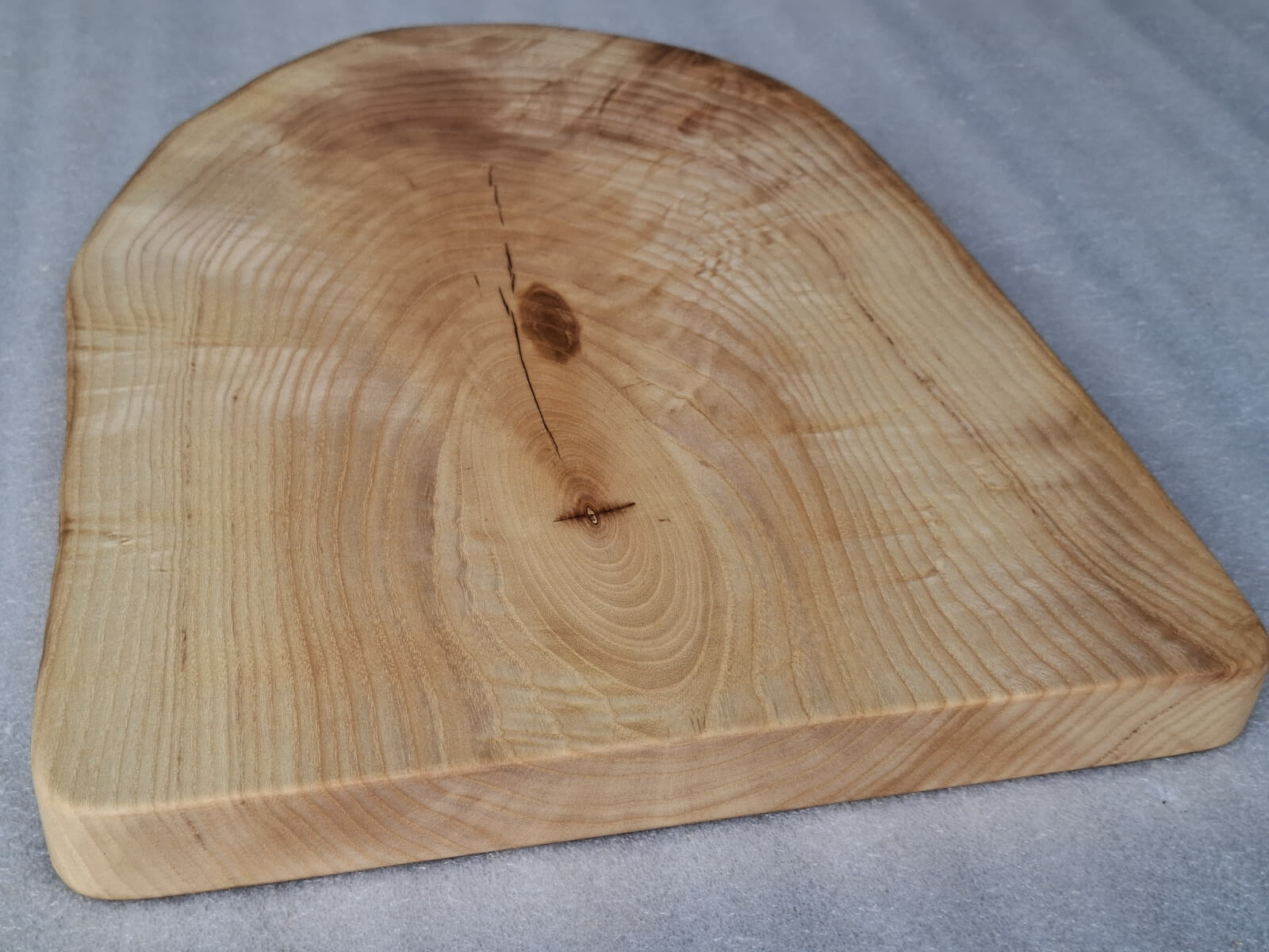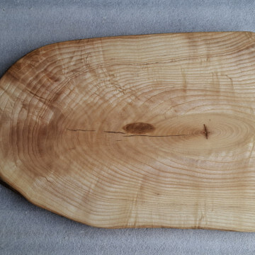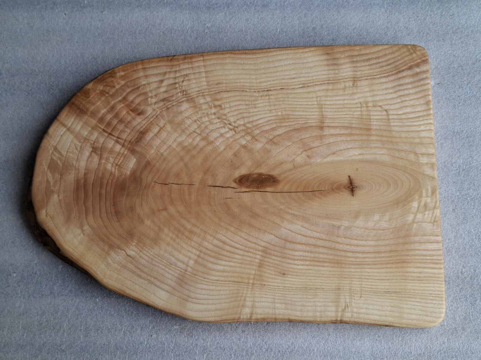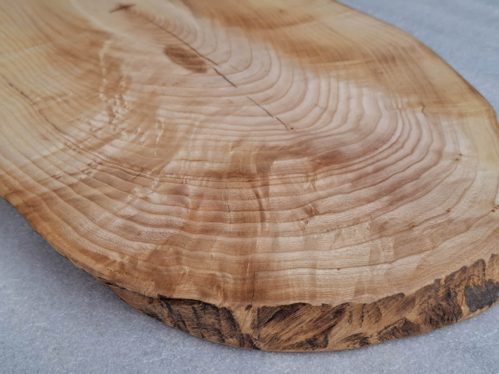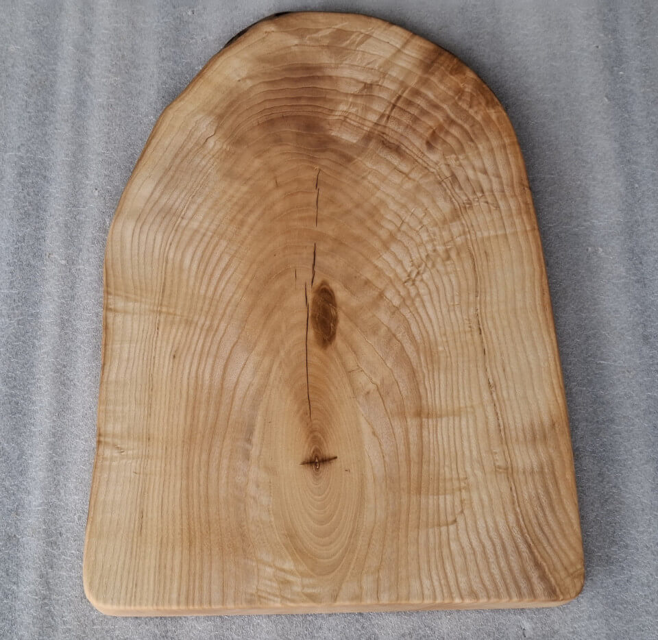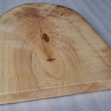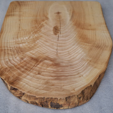 Kitchen board made of 30 mm thick Ash wood, oval shape, live edge, soaked in natural linseed oil.