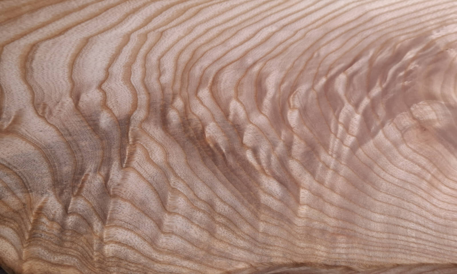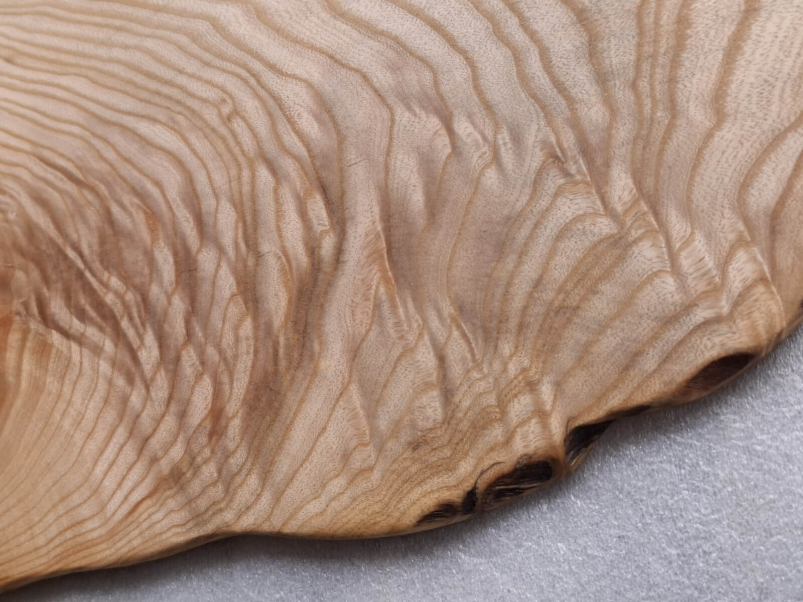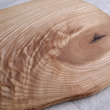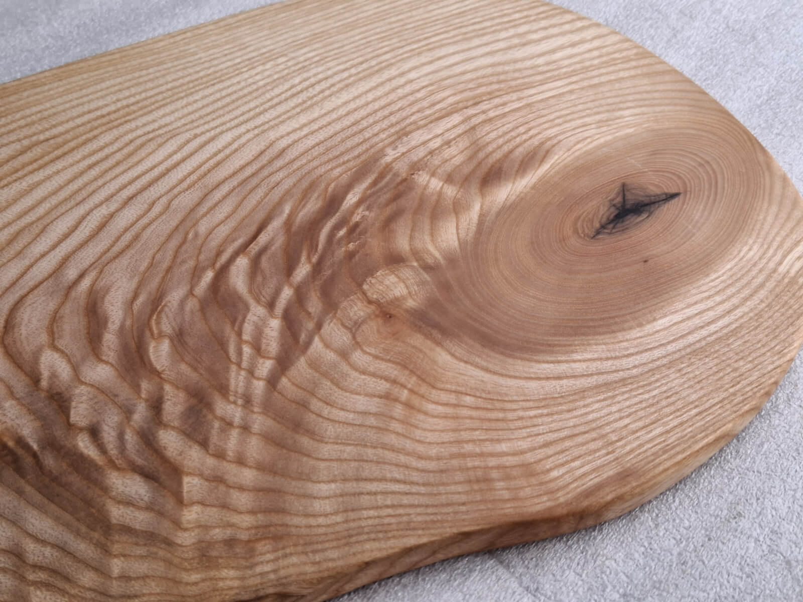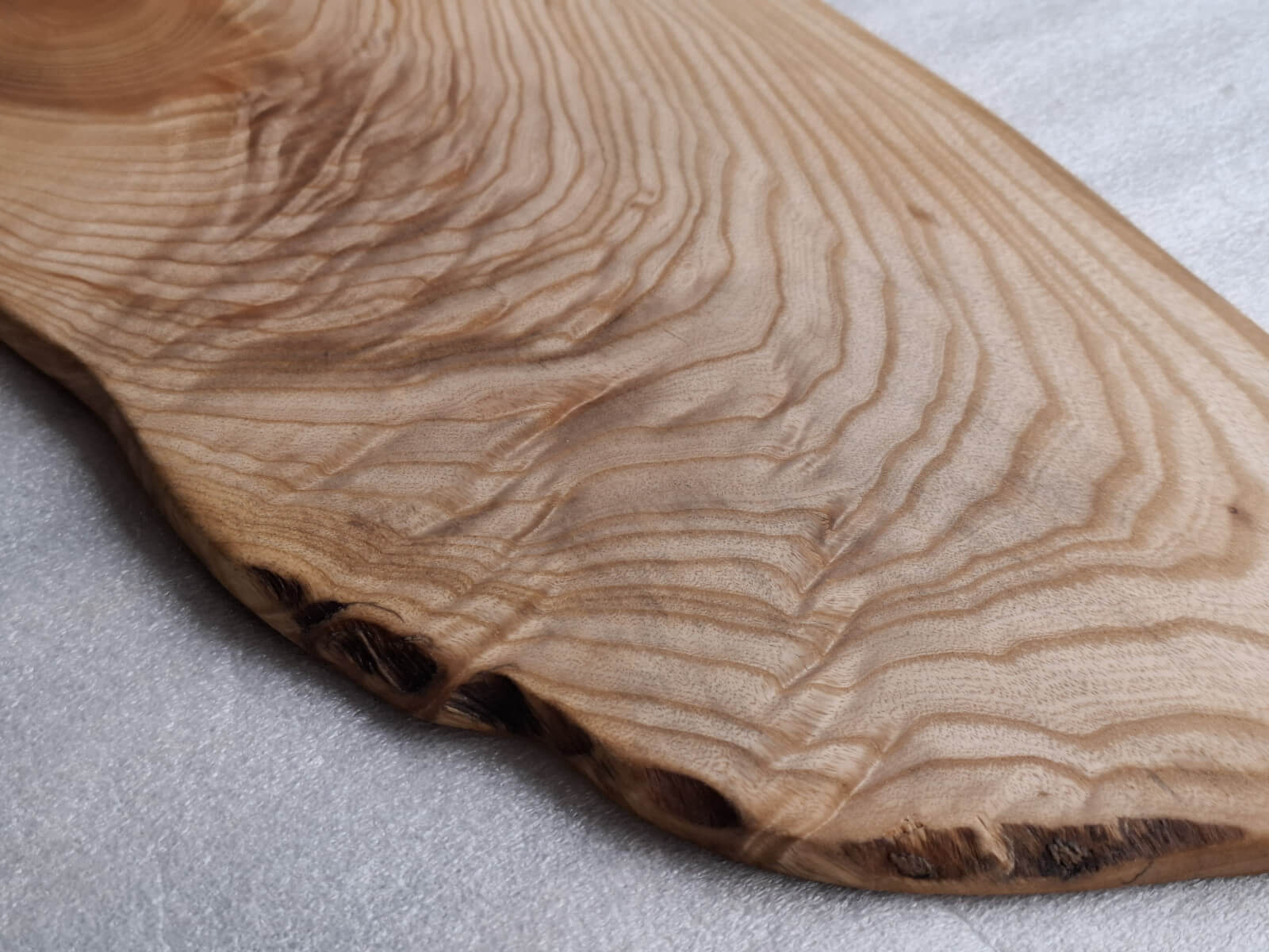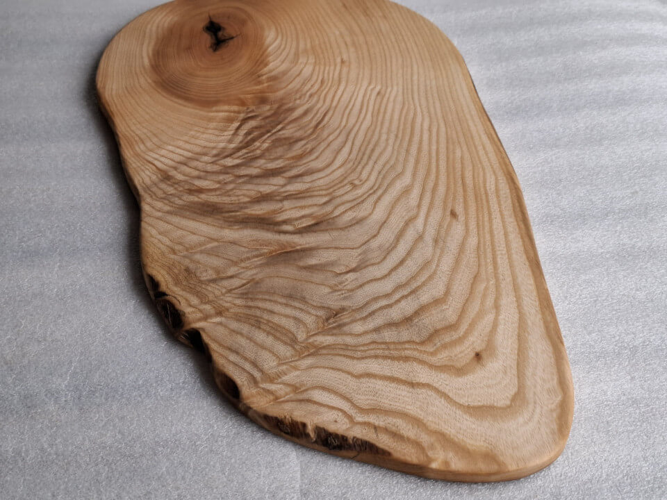 Kitchen board, serving tray made of Ash wood 15 mm thick, oval shape, live edge, soaked in natural linseed oil.