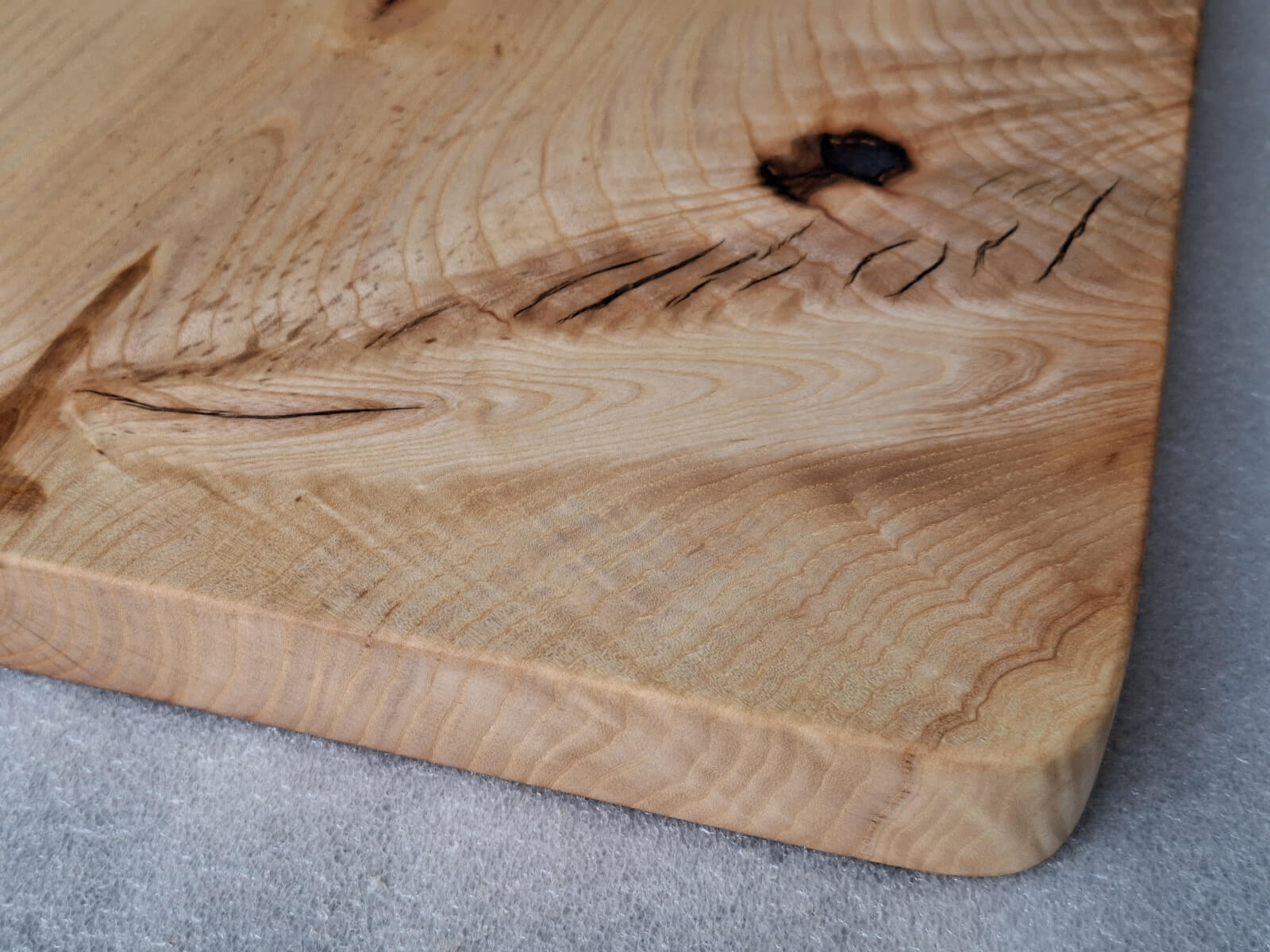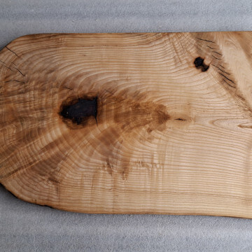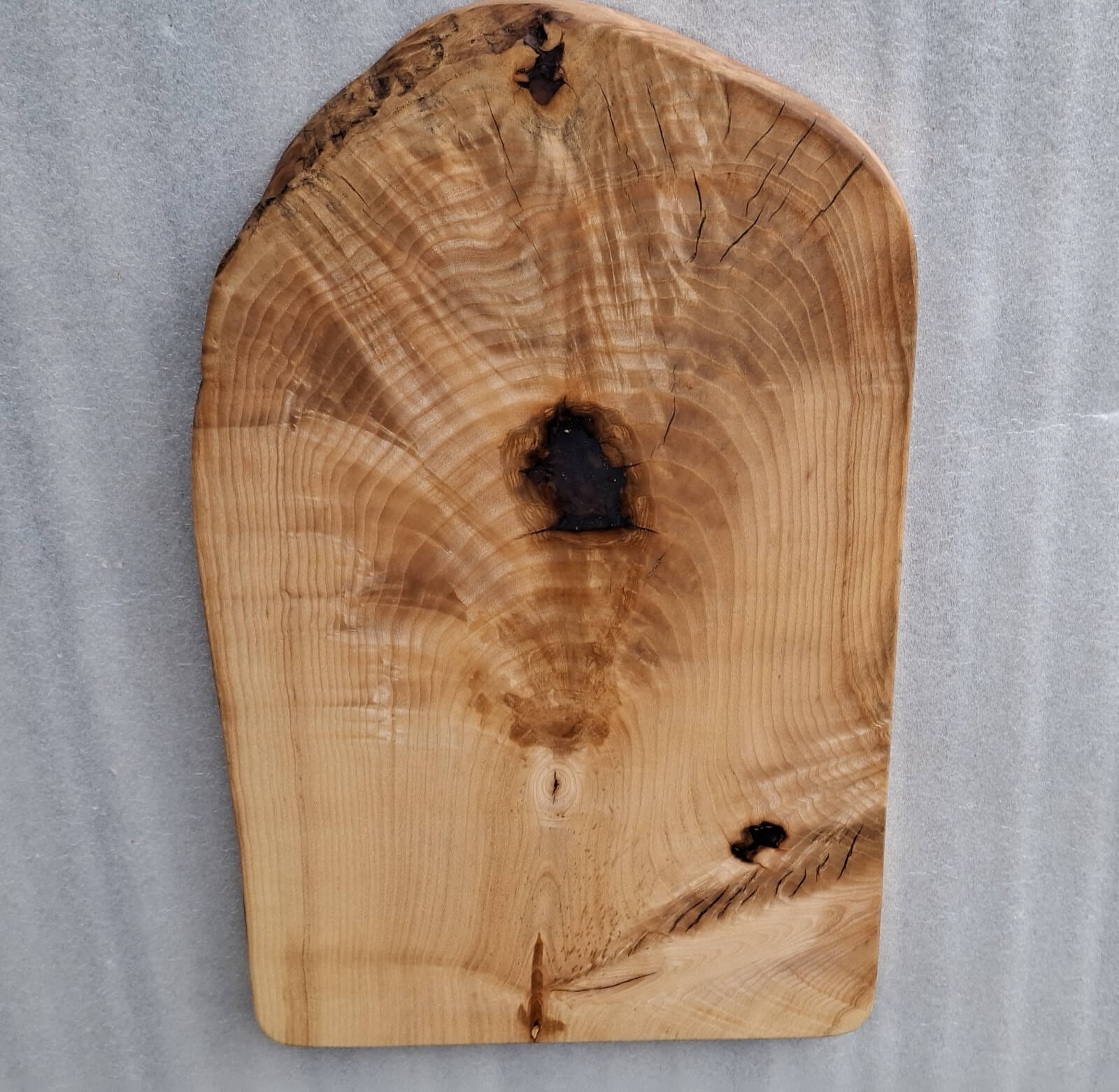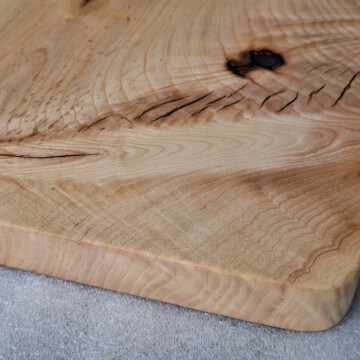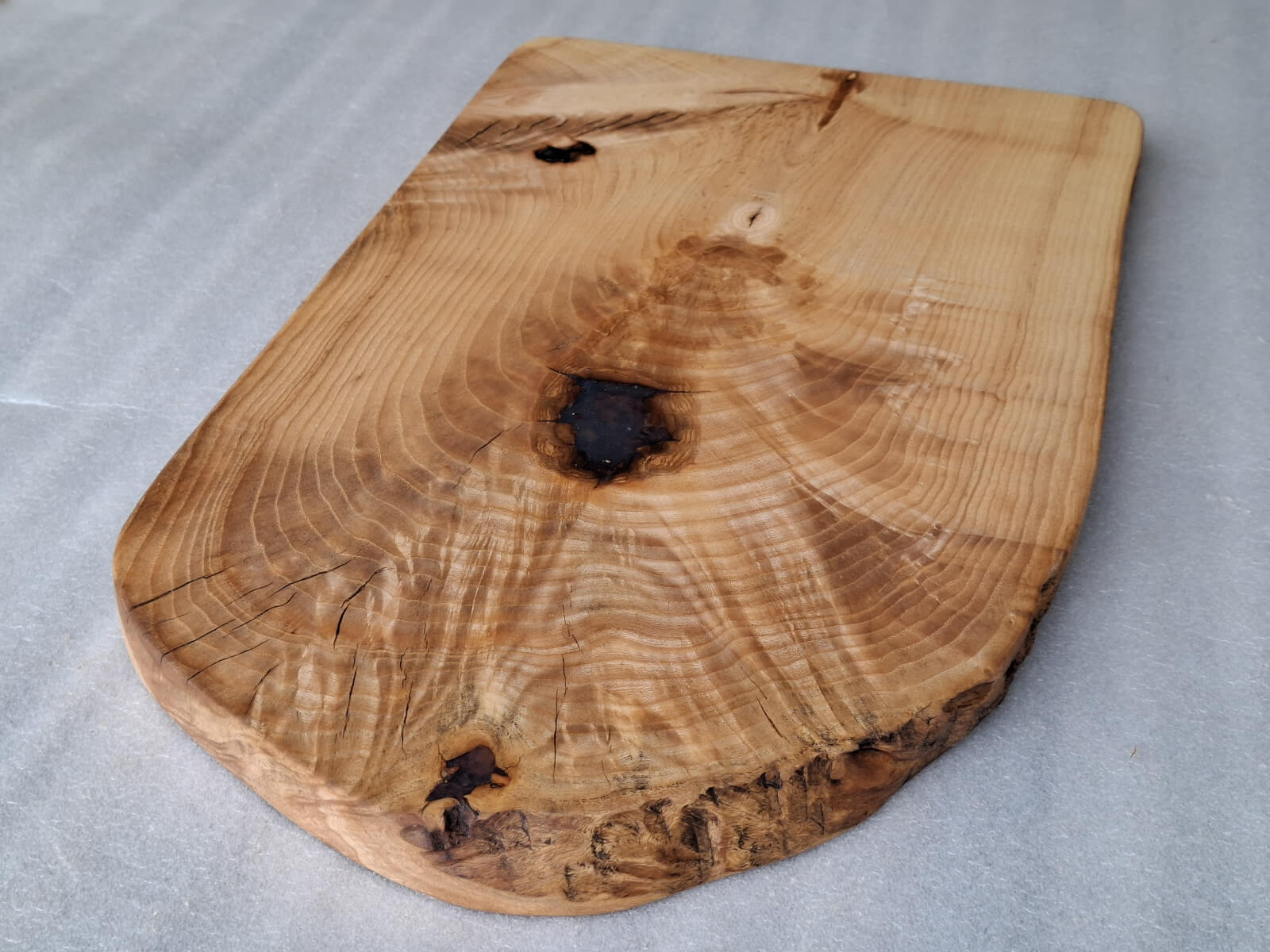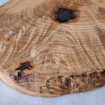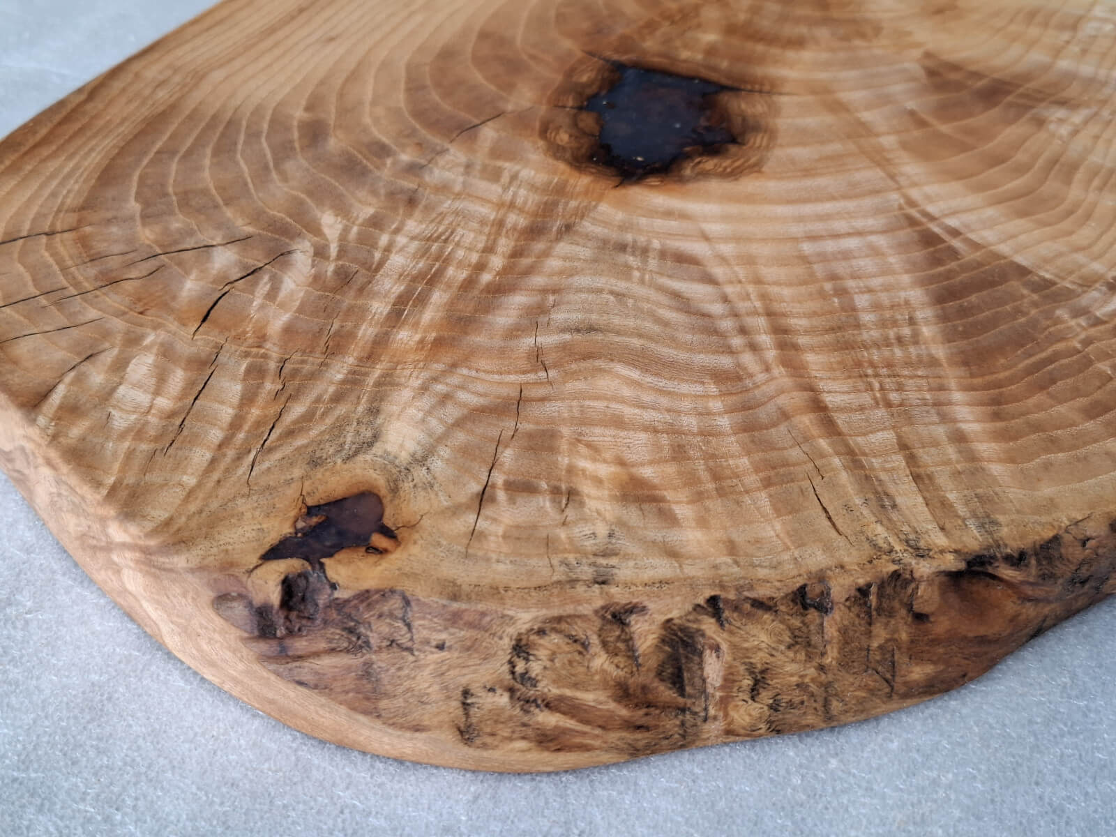 Kitchen board, made of 30 mm thick Ash wood, oval shape, live edge, soaked in natural linseed oil.