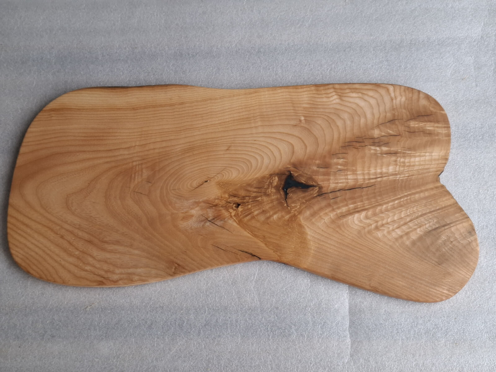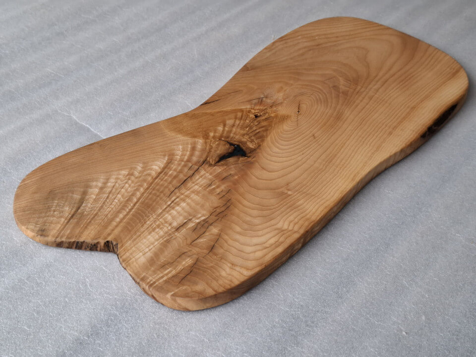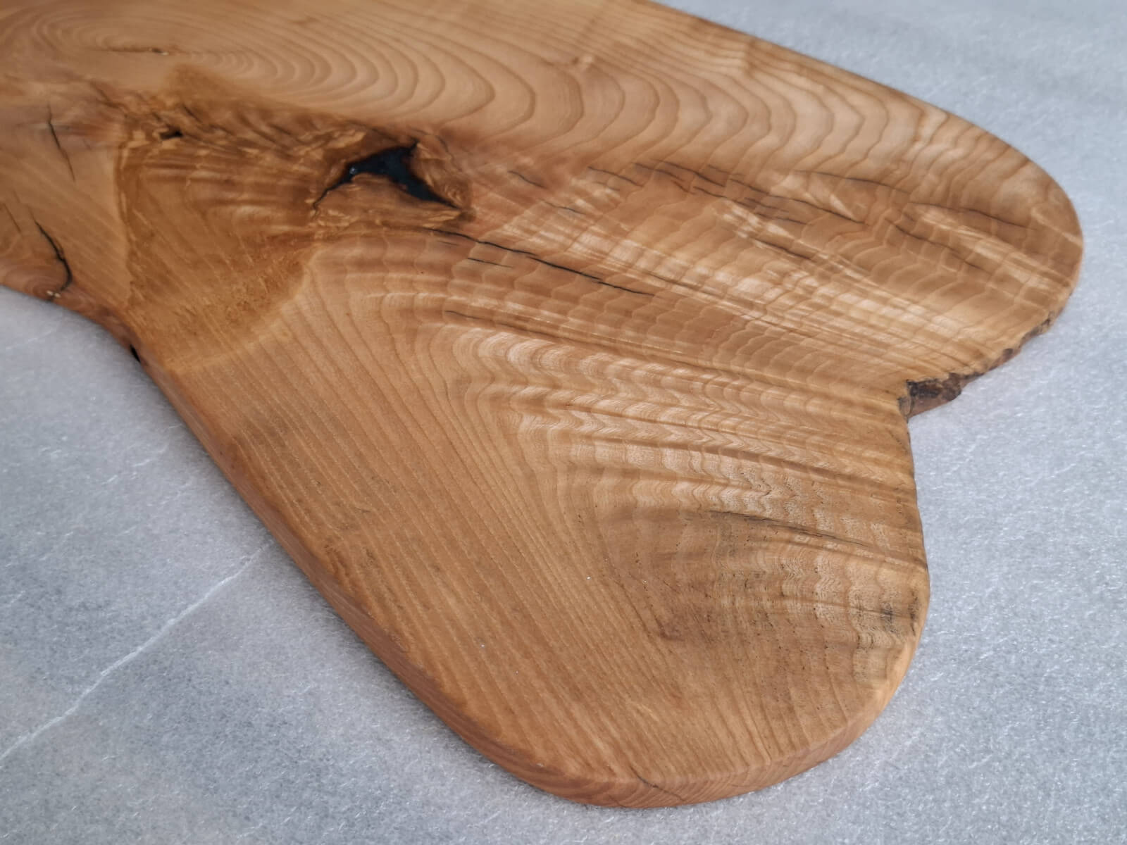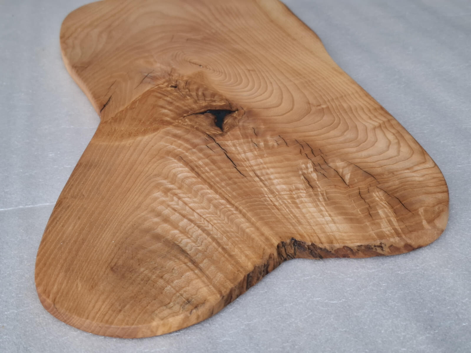 Kitchen board, serving tray made of Ash wood 15 mm thick, oval shape, live edge, soaked in natural linseed oil.