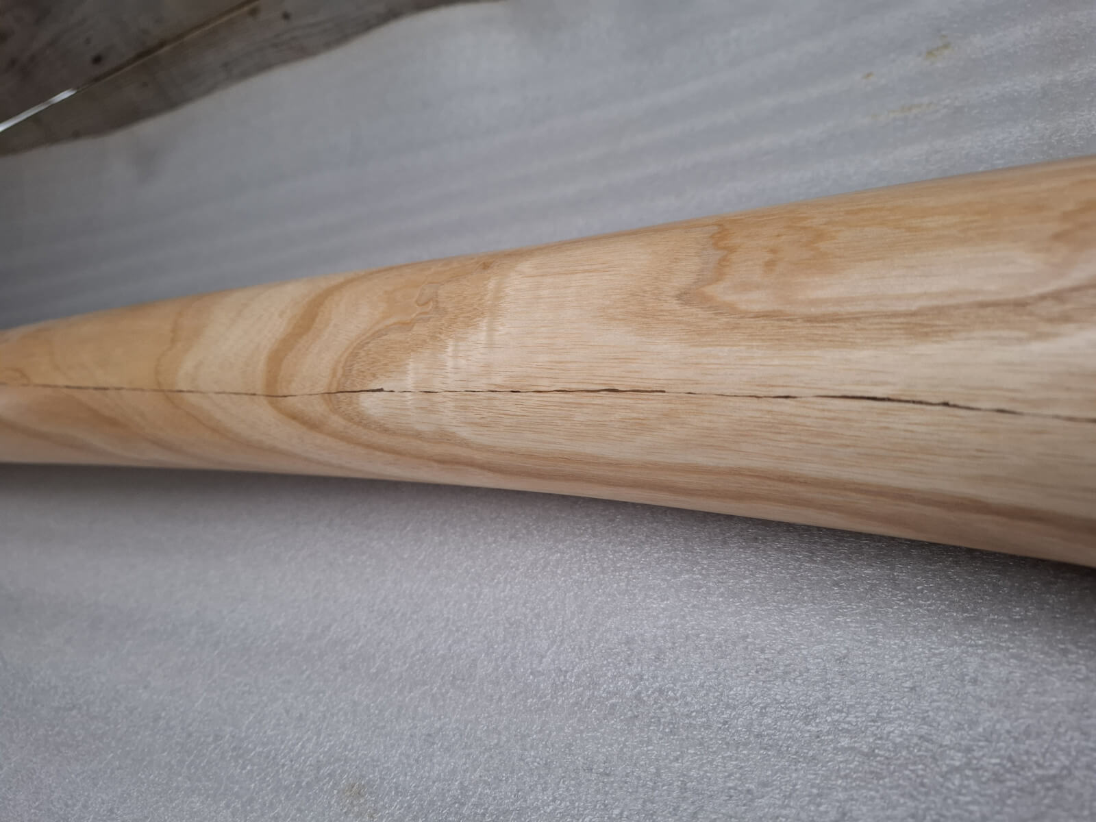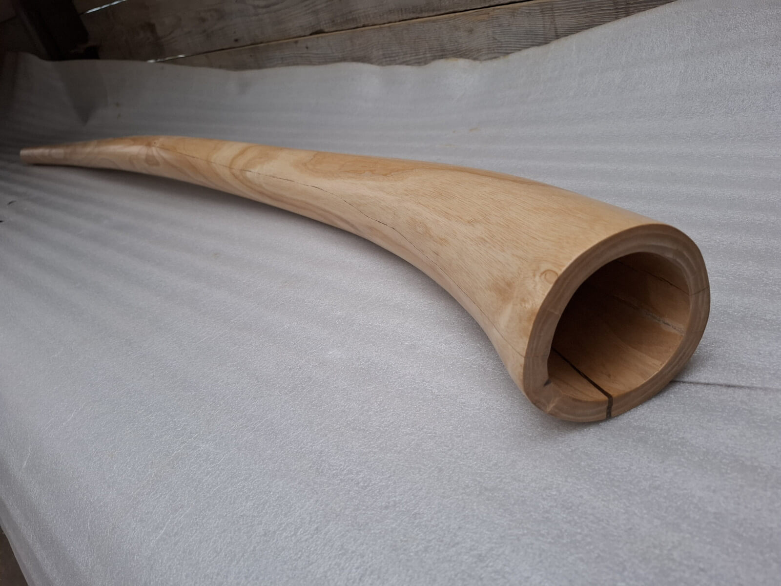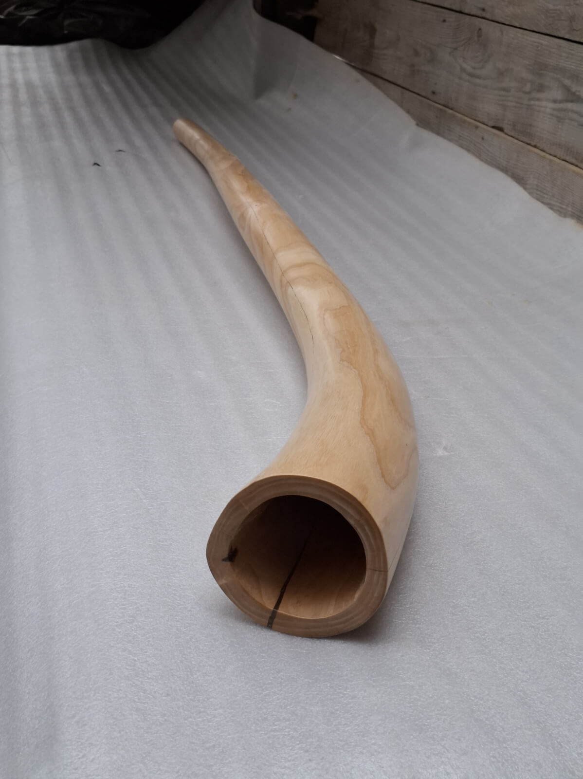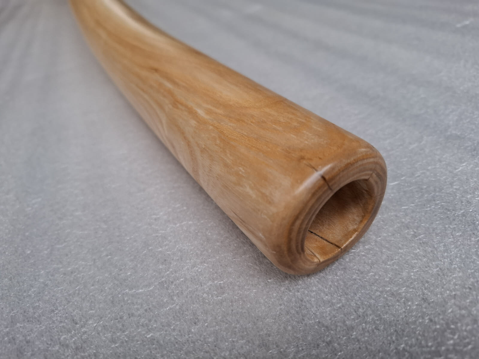 Didgeridoo made of ash wood. Length 175cm, bell diameter 12.5cm, wall thickness 14/11mm, Tone C#/D, natural color of ash wood, matte varnish on the outside, damar and beeswax mixture on the inside. Mouthpiece profiled from wood, inner diameter 3cm.