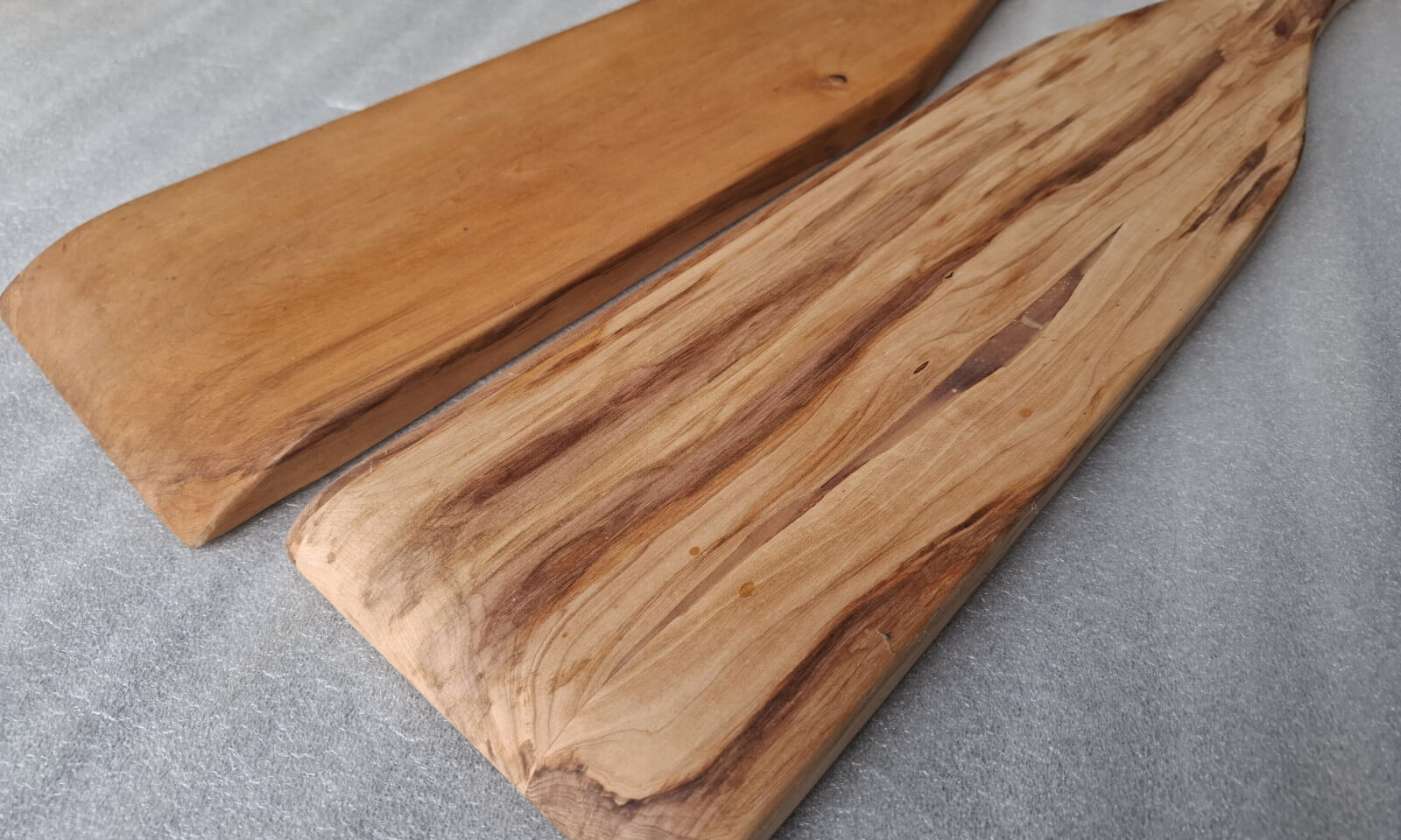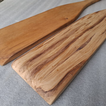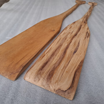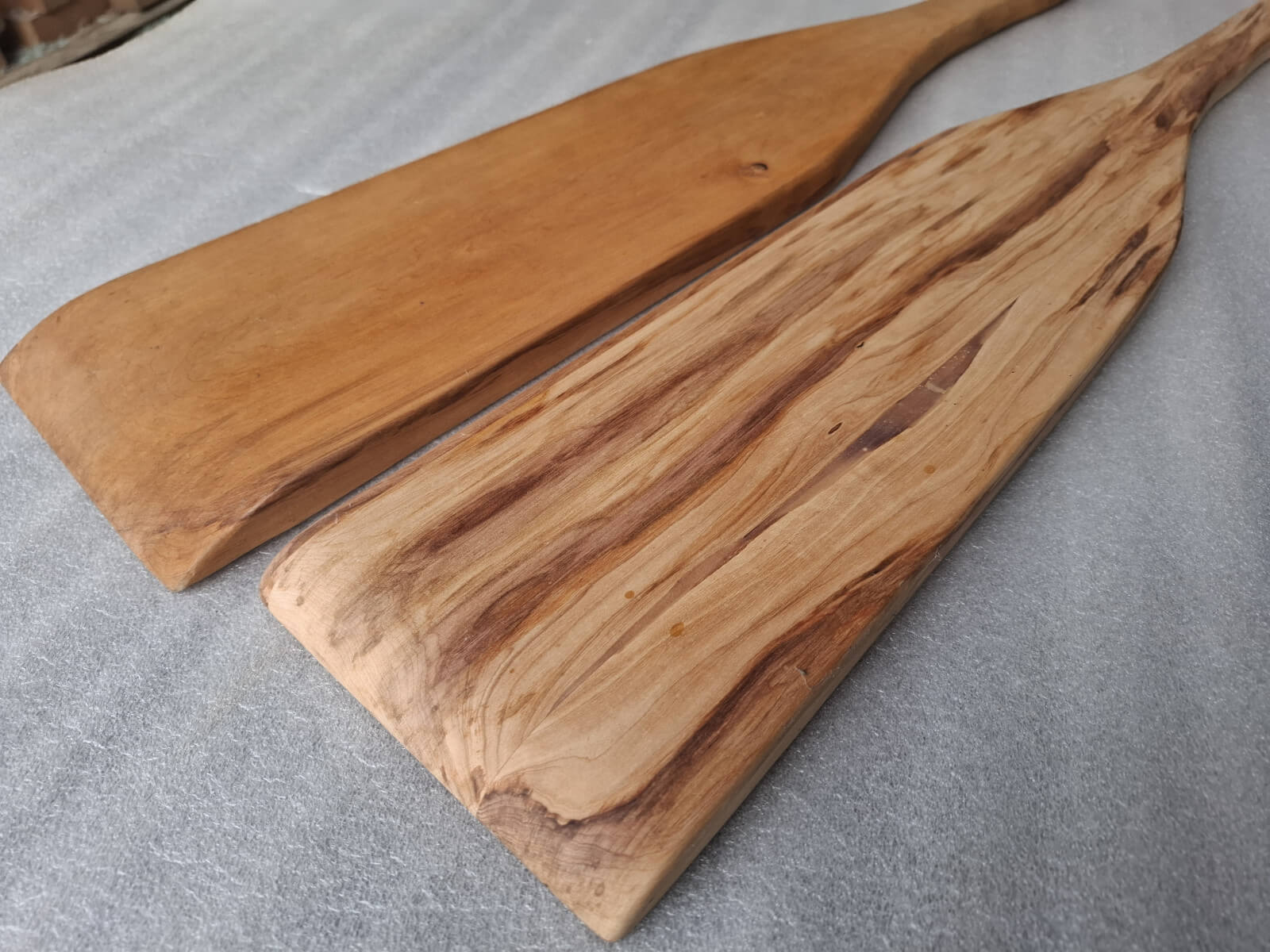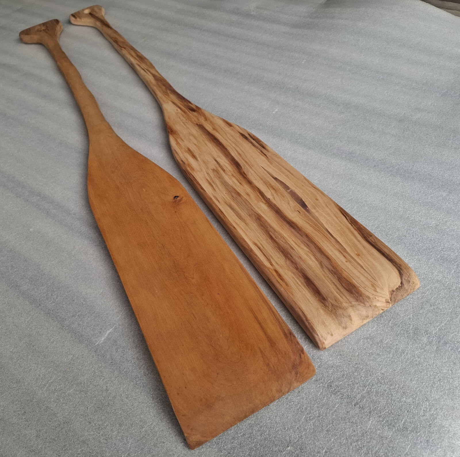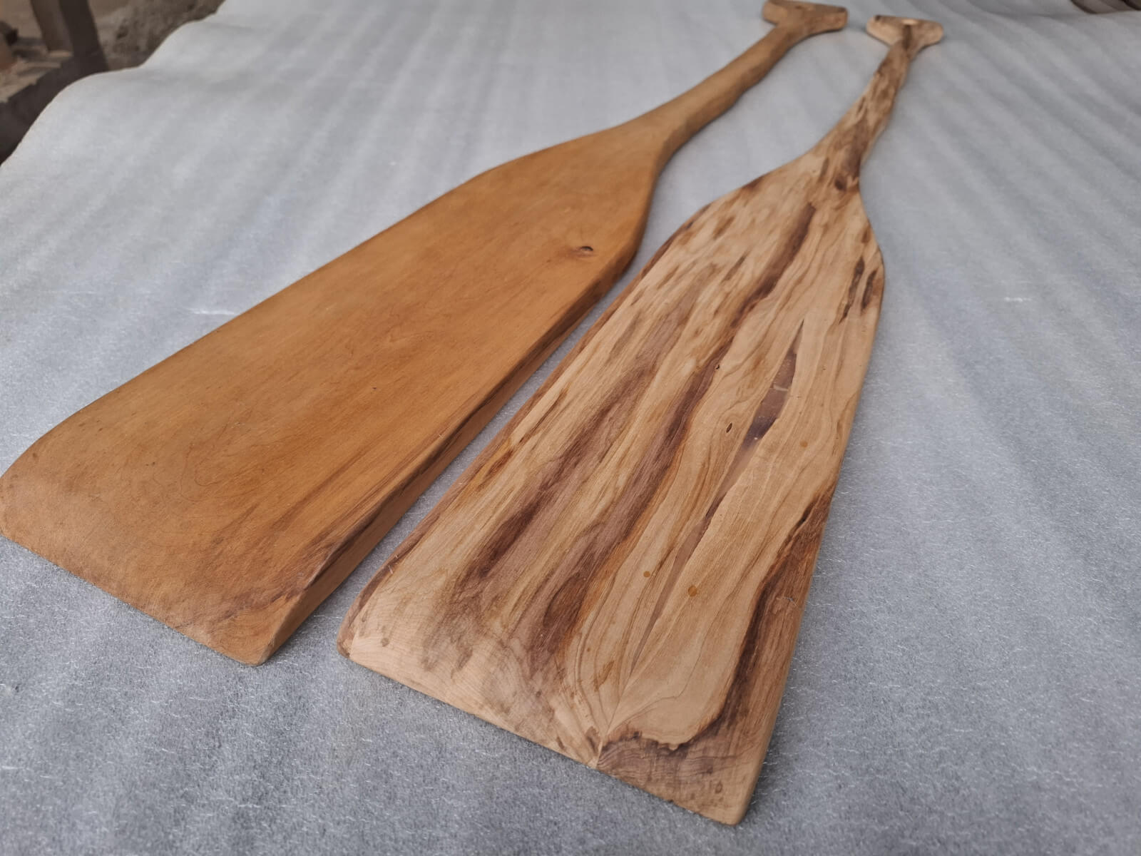 Two paddles/rows made of alder wood, one once used for mixing red wine, therefore darker, can also be used as shovels for bread oven. Dimensions 105x15cm. Price for two pieces.
