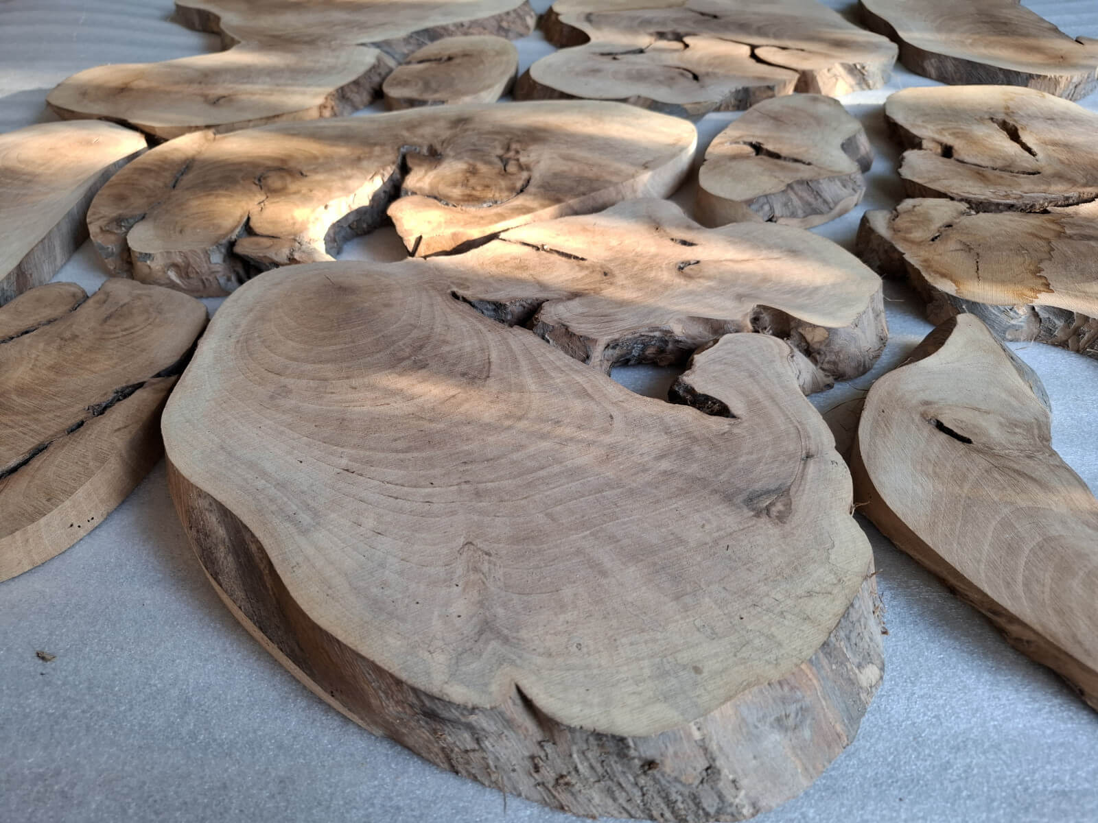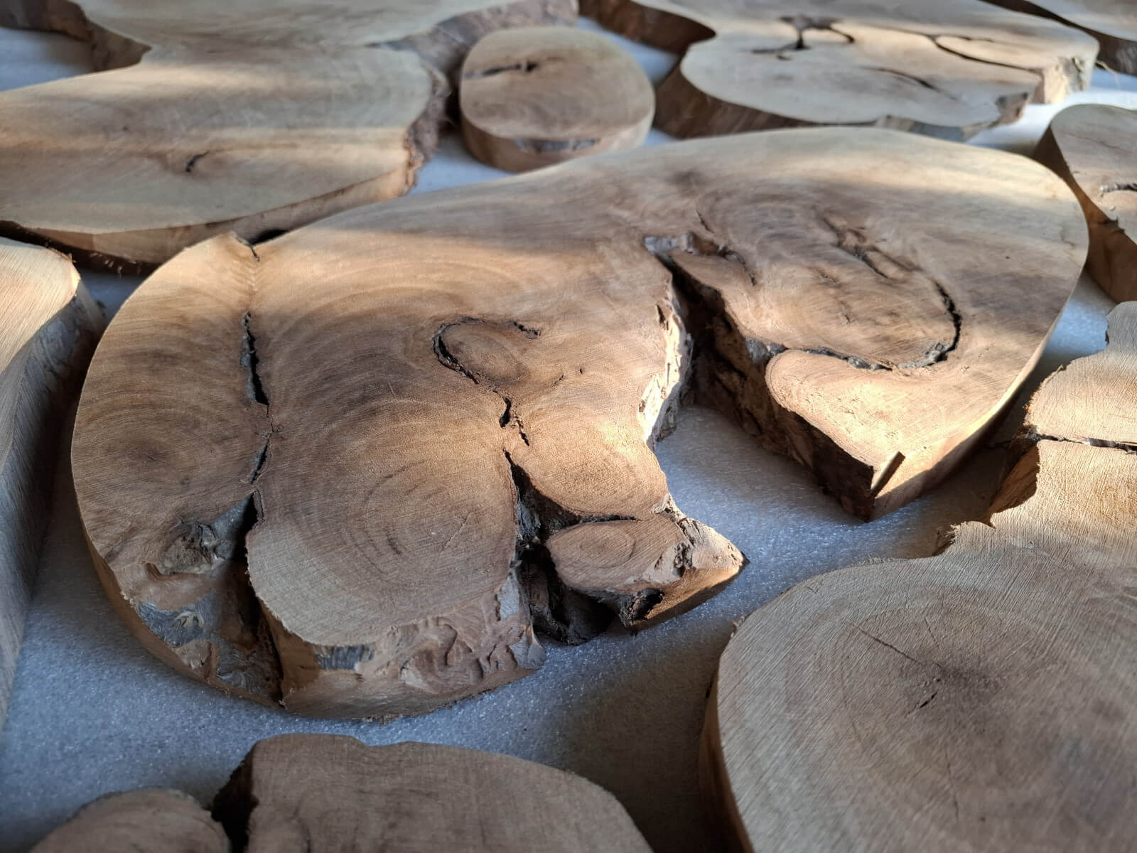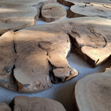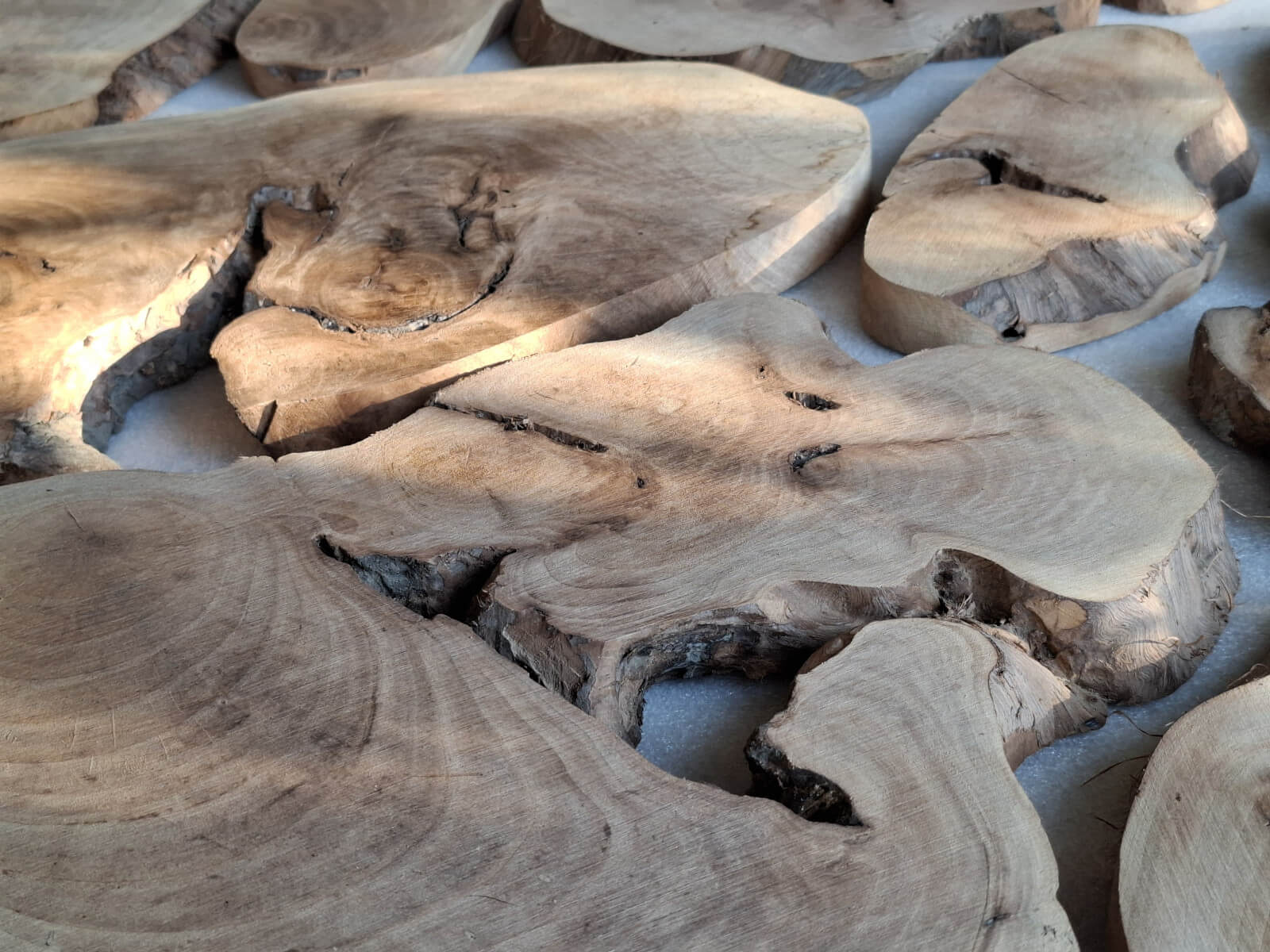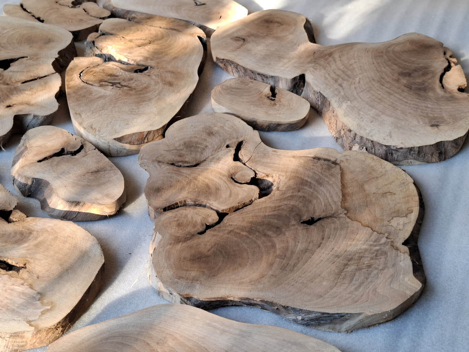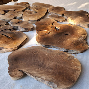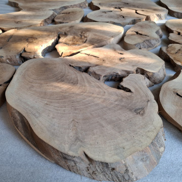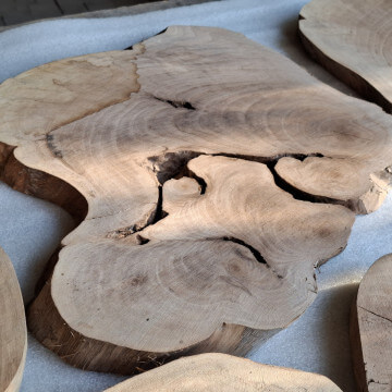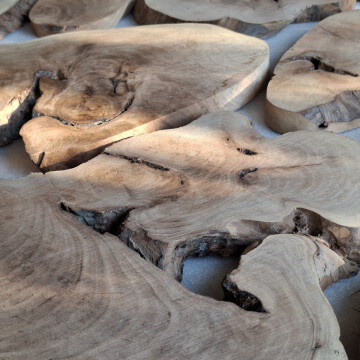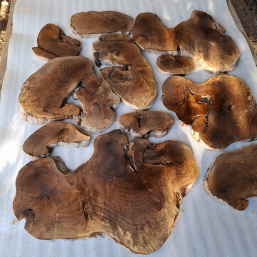 Archipelag plastrów z korzenia orzecha włoskiego. Drewno suche, kora usunięta i wydłubana ze wszystkich zakamarków, powierzchnia wstępnie szlifowana, do dalszego szlifowania/szczotkowania. W sumie 11szt. różnej wielkości i kształtów, szerokości między 10-60cm, grubość 2-2.5cm, miejscami dochodzi do 3.5cm, bo w korzeniu były kamyki i taki właśnie miały wpływ na prowadzenie piły. Przykładowa kompozycja na zdjęciach to około 1m2 powierzchni, zmoczone wodą na zdjęciu, ciemno brązowe, tak by ostatecznie wyglądały po nałożeniu powłoki bezbarwnej.