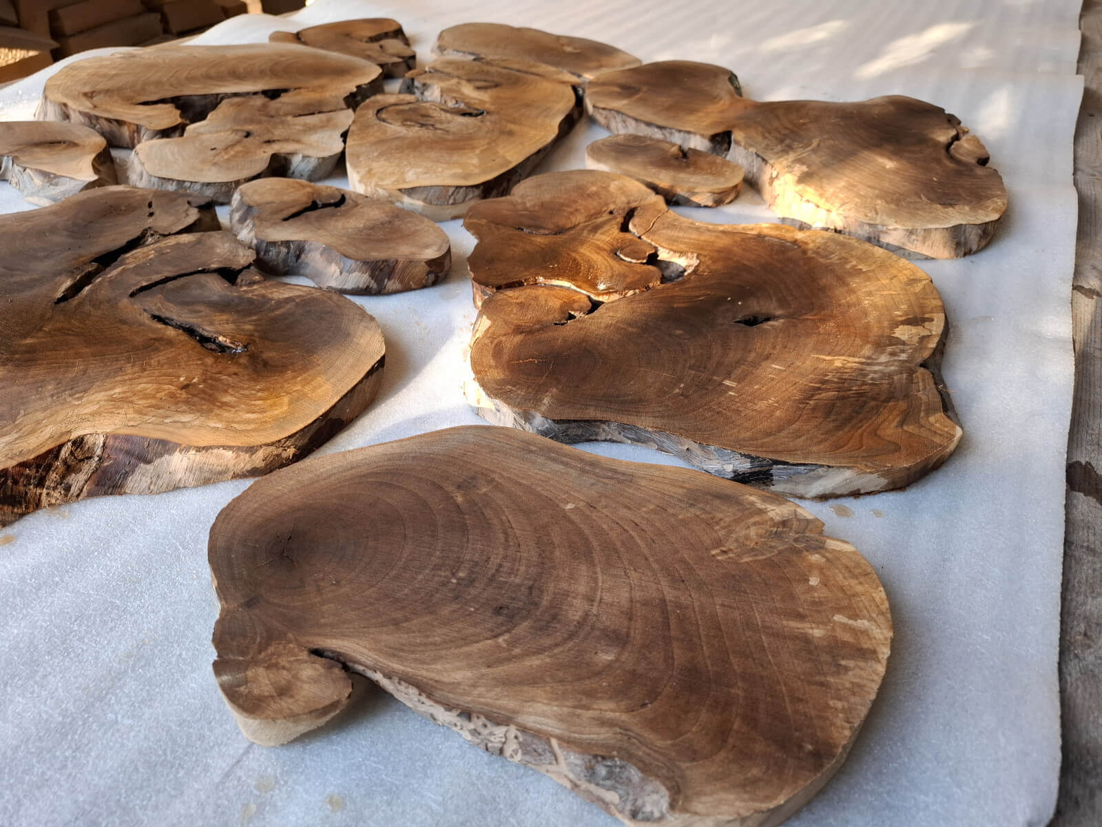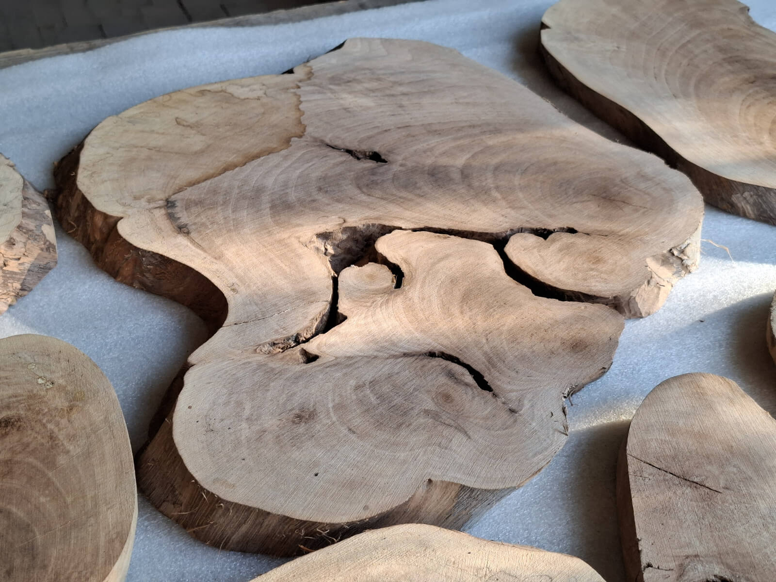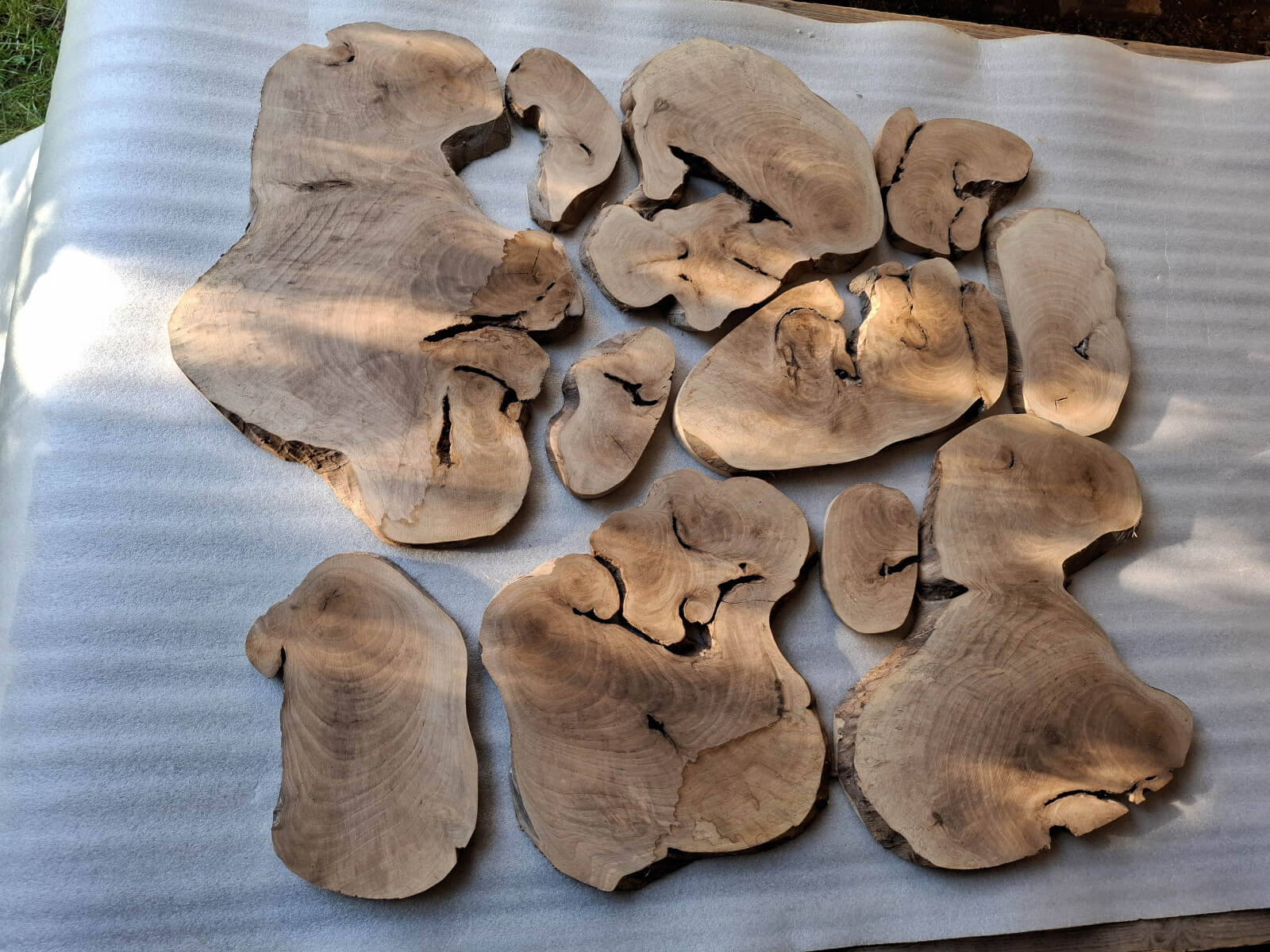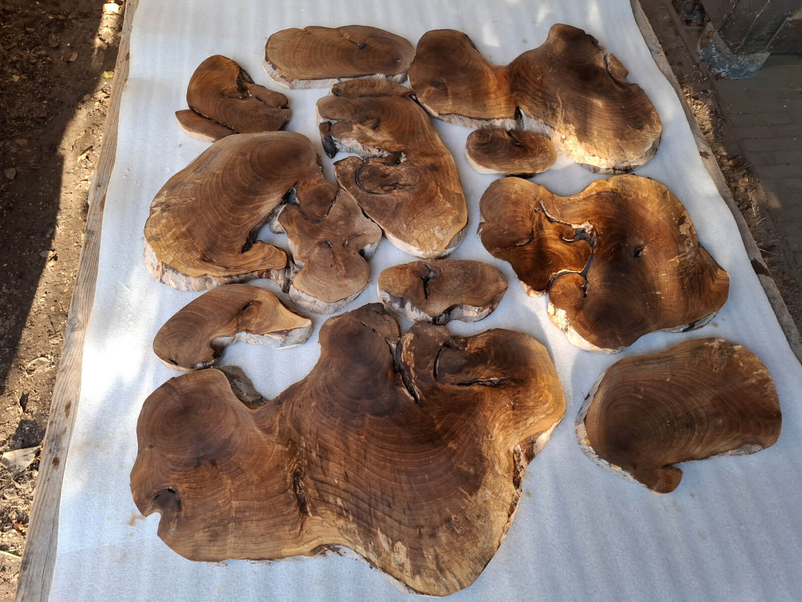 Archipelag plastrów z korzenia orzecha włoskiego. Drewno suche, kora usunięta i wydłubana ze wszystkich zakamarków, powierzchnia wstępnie szlifowana, do dalszego szlifowania/szczotkowania. W sumie 11szt. różnej wielkości i kształtów, szerokości między 10-60cm, grubość 2-2.5cm, miejscami dochodzi do 3.5cm, bo w korzeniu były kamyki i taki właśnie miały wpływ na prowadzenie piły. Przykładowa kompozycja na zdjęciach to około 1m2 powierzchni, zmoczone wodą na zdjęciu, ciemno brązowe, tak by ostatecznie wyglądały po nałożeniu powłoki bezbarwnej.