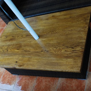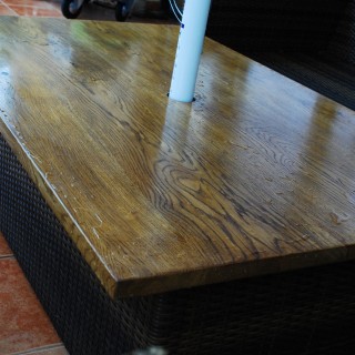 Blat Dębowy ogrodowy, 30 mm grubości, barwiony na średni brąz, lakier jachtowy. Wymiary 130 x 80 cm.