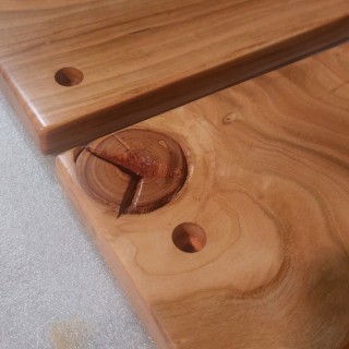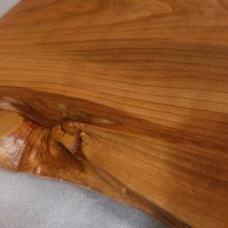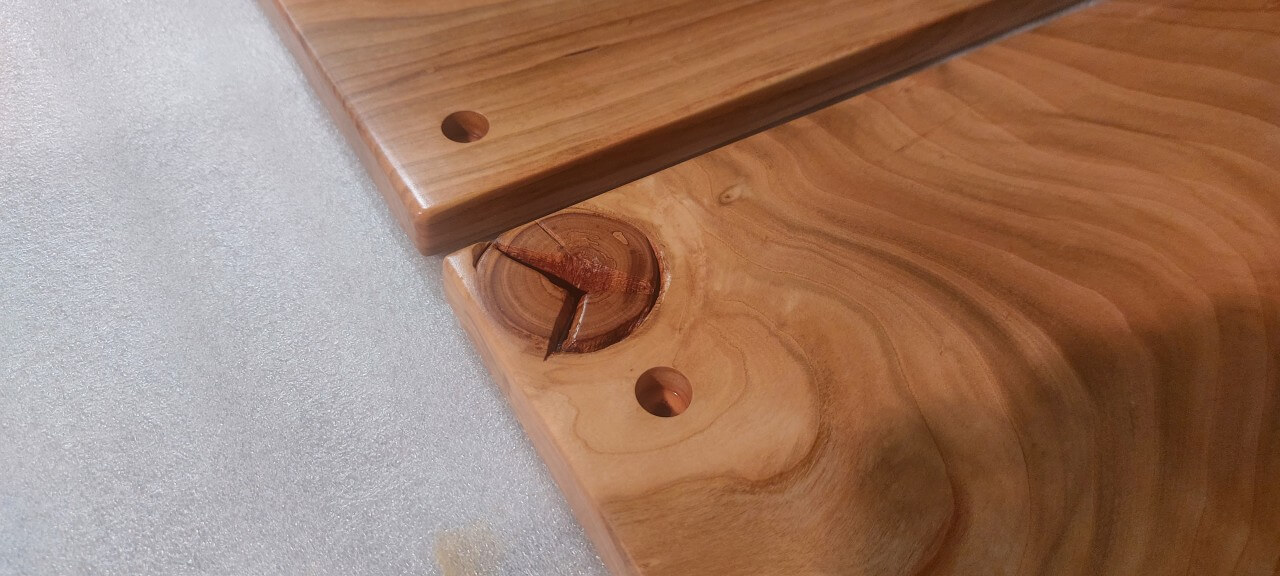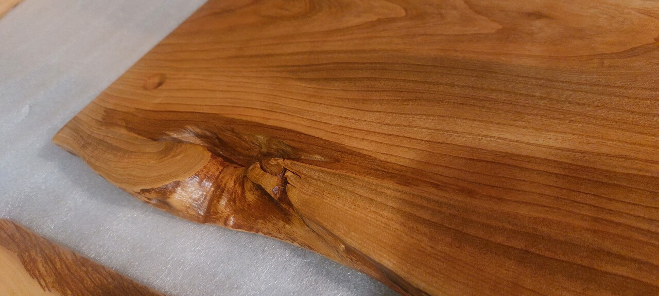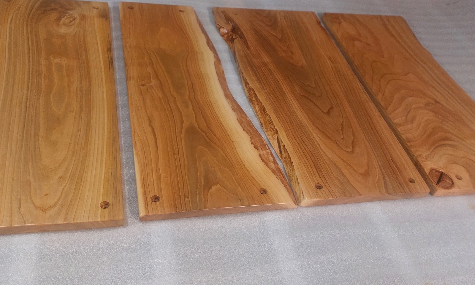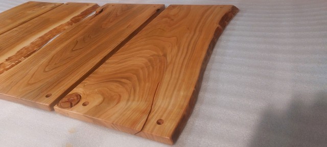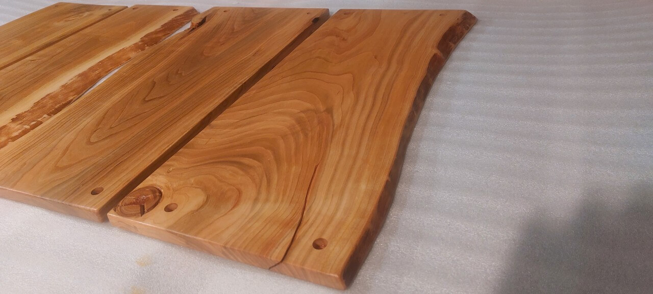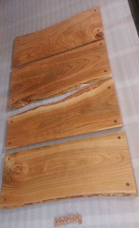 Komplet 4 desek z drewna czereśni, wykonane na zamówienie do mocowania na ścianie jako osłona przed zabrudzeniem ściany. Krawędzie naturalne, lakier mat.
