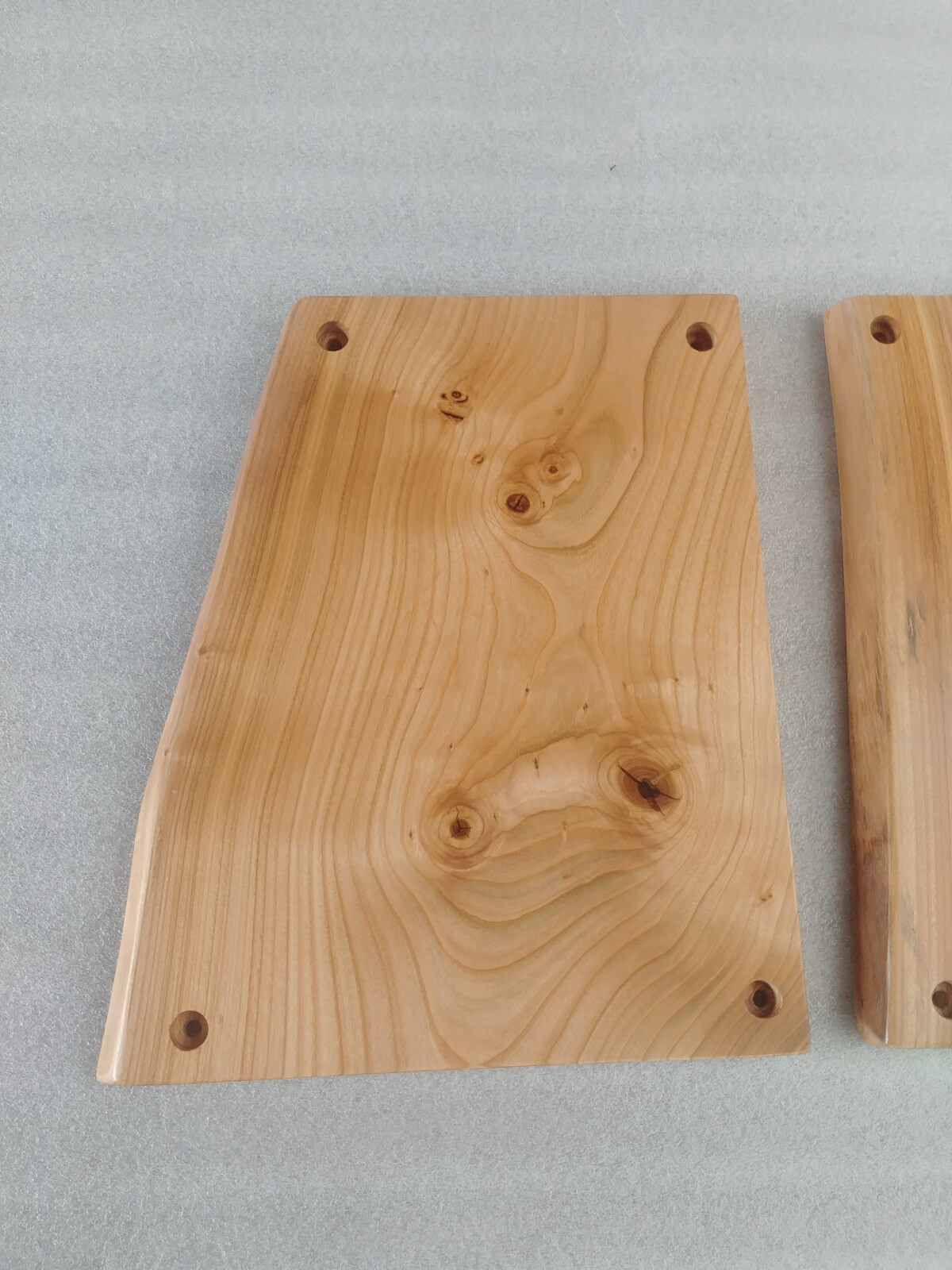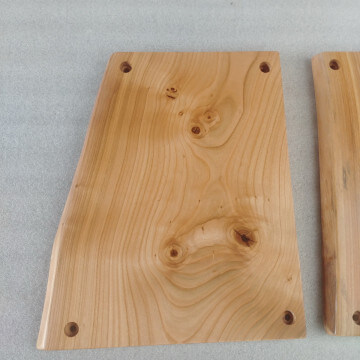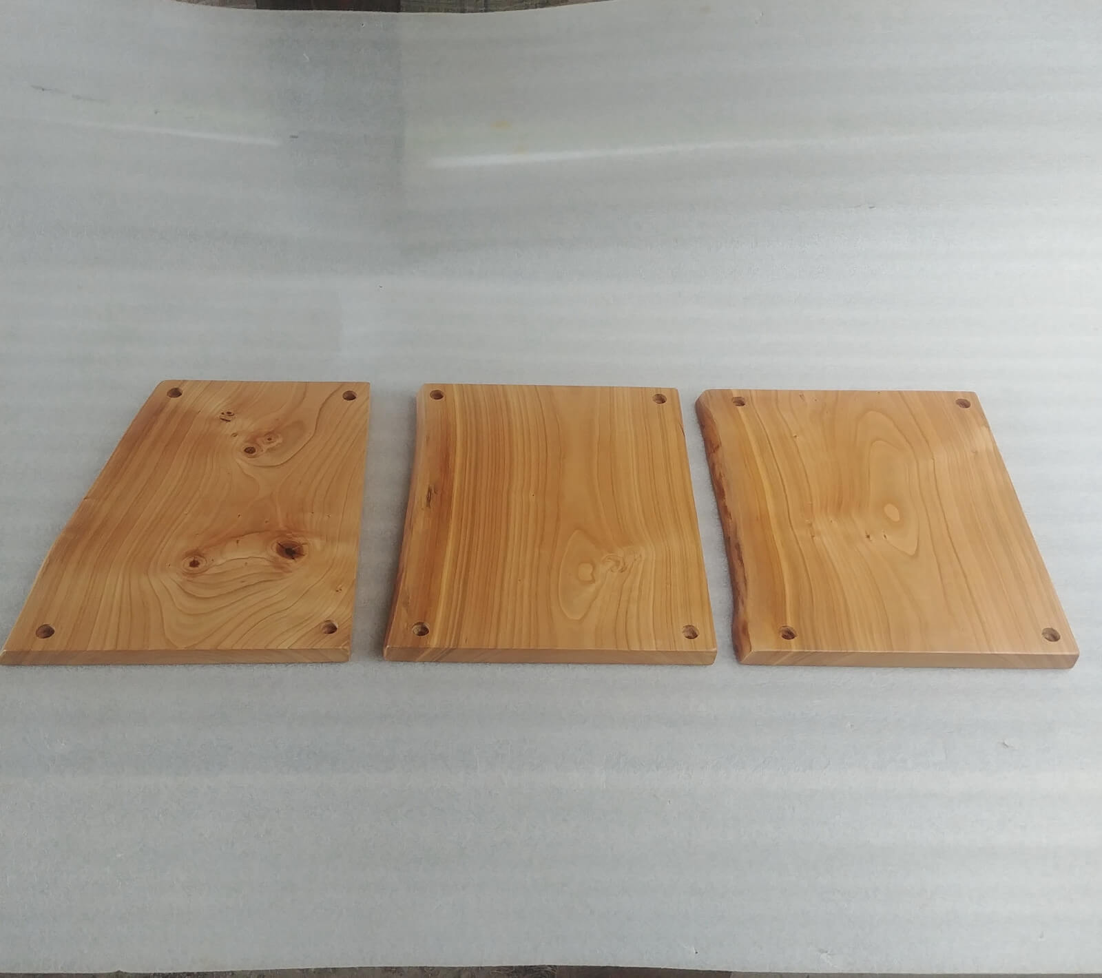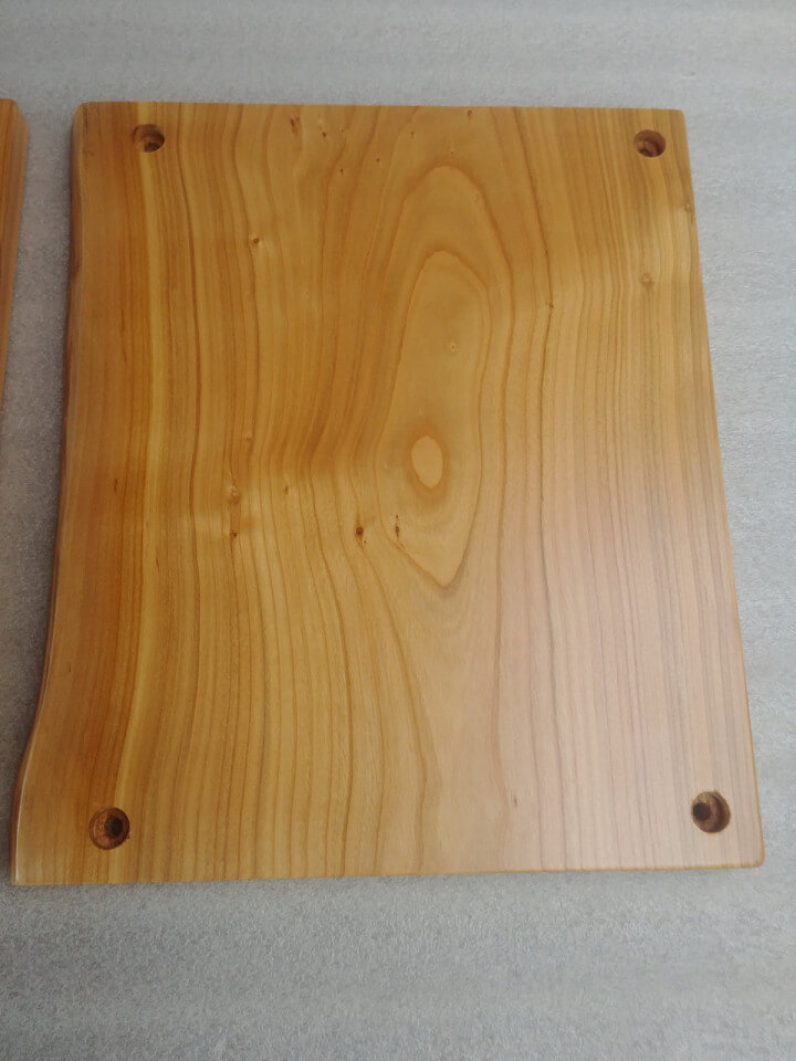 Komplet 3 desek z drewna czereśni, wykonane na zamówienie do mocowania na ścianie jako osłona przed zabrudzeniem ściany. Krawędzie naturalne, lakier mat.