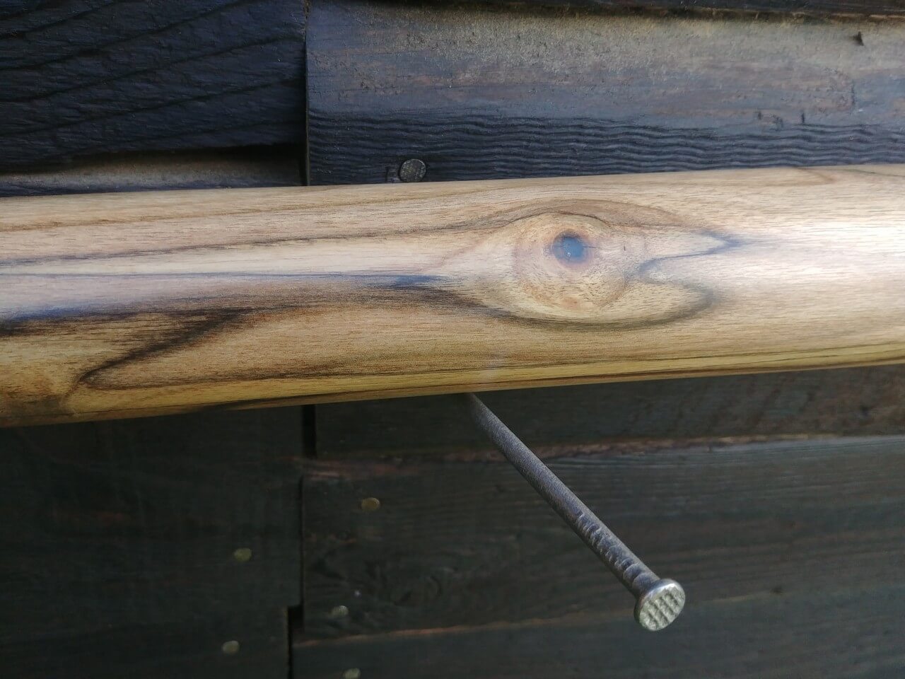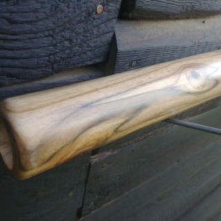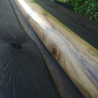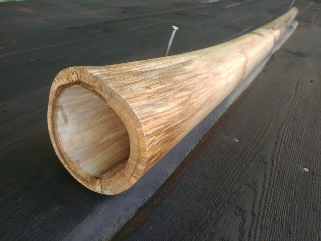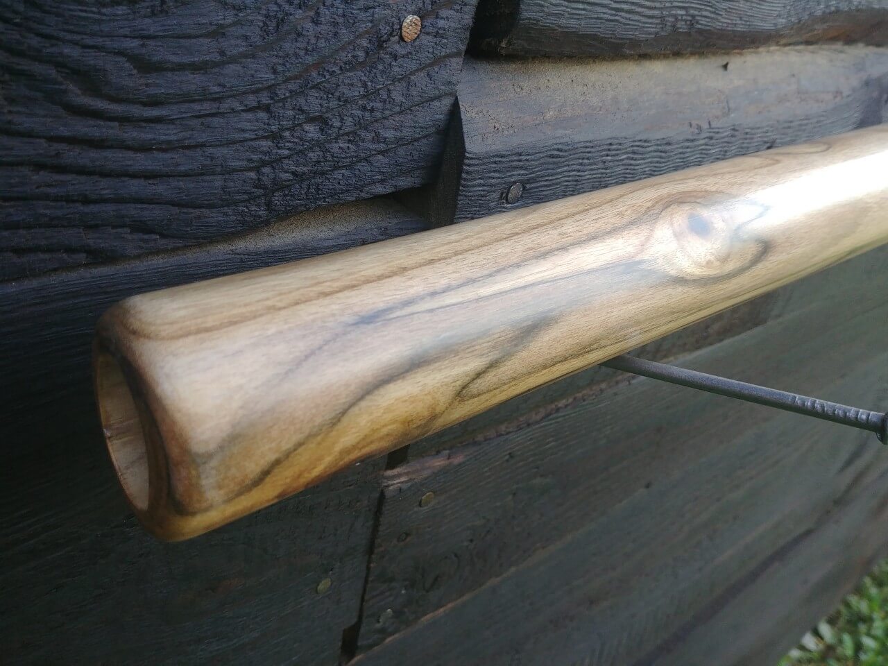 Didgeridoo z orzecha włoskiego. Długość 195 cm, średnica dzwonu 13 cm, grubość ścianki 1.2 cm, kolor naturalny, jasny, od zewnątrz lakier matowy, od wewnątrz mieszanka damary i wosku pszczelego.