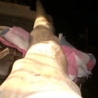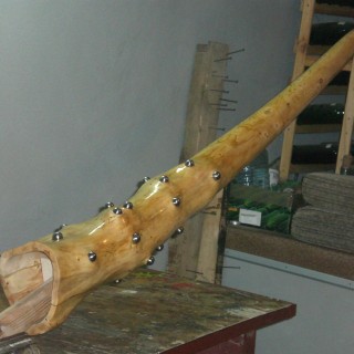 Didgeridoo wykonane ze świerka rezonansowego. dł 165cm, Tonacja D, grubość ścianki 1,8mm. Instrument wszechstronny, głośny. Ozdobiony okrągłymi metalowymi ćwiekami na końcówkach sęków.