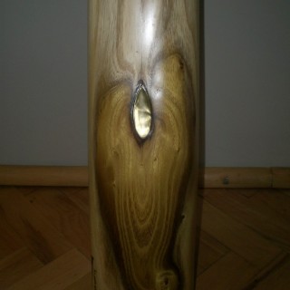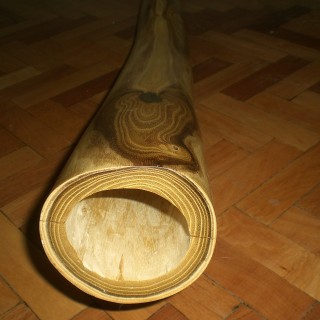Didgeridoo z pnia akacji o długości 135 cm, grubość ścianek 1.8 mm. Naturalna barwa drewna koloru zielono-złotego tworzy wyraziste wzory, ozdobione mosiężnym listkiem w centralnym punkcie. Instrument gra w tonacji E, czysto i głośno, ogólnie wszechstronny ale raczej do szybkiej, dynamicznej gry.