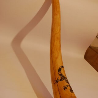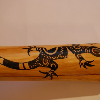 Didgeridoo z pnia Jesionu, kolor naturalny, przy dzwonie ręcznie malowany motyw jaszczurki inkrustowany kamieniami półszlachetnymi, przy ustniku dookoła wzorek ozdobny.