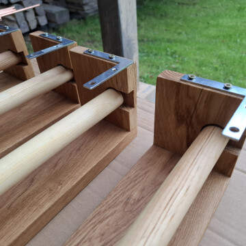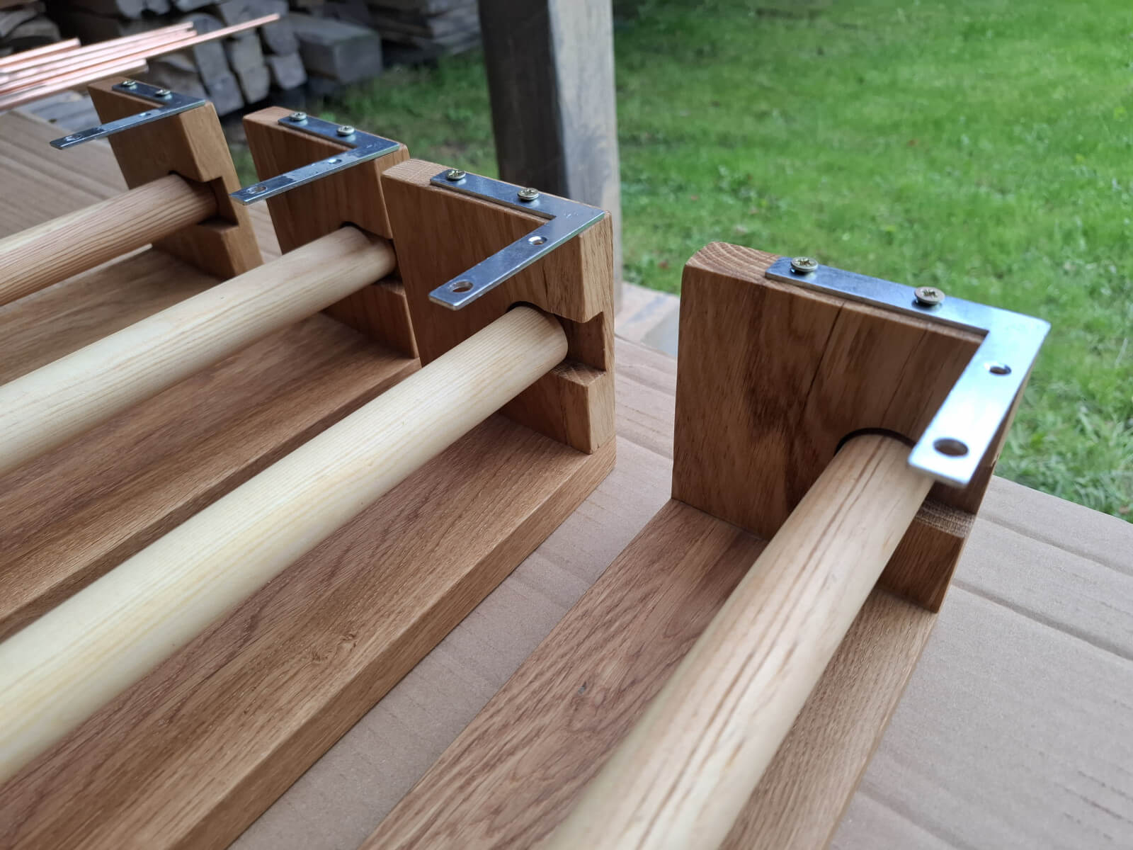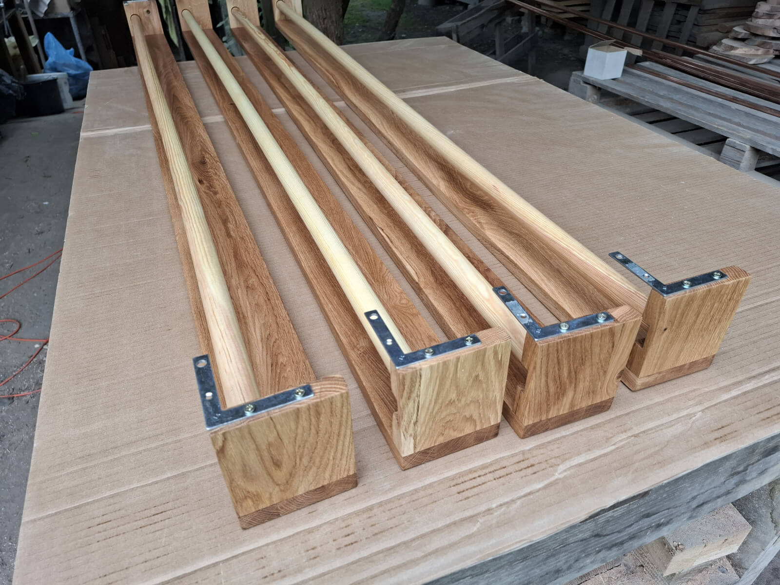 Tradycyjne karnisze z Dębu, jednorzędowe, na drążki, prosty profil boczny, kolor naturalny, olejowane. Długości, i wykończenie na zamówienie.