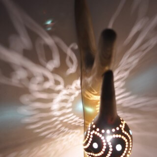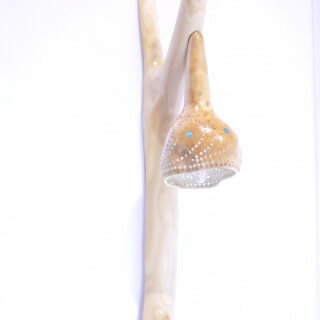 Kinkiet z drewna jesionu w stylu samorodnym, pokryty lakierem bezbarwnym poliuretanowym - półmat. Klosz wykonany z tykwy z nawierconymi dziurkami i wklejonymi szkiełkami - wszystko to po zaświeceniu daje niepowtarzalny efekt. Wyposażona w blaszkę do zawieszenia, haczyk montażowy i standardową żarówkę z wąskim gwintem typu świeca.