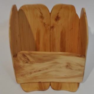Niebanalny pojemnik na przybory, długopisy, sztućce, itd. Wykonany z cienkich, wąskich deszczułek jabłoni, z pociętych gałązek, które są miniaturami litych nieobrzynanych desek dużego formatu. W ułożeniu usłojenia boków zachowana jest symetria, krawędzie naturalnie nieregularne.