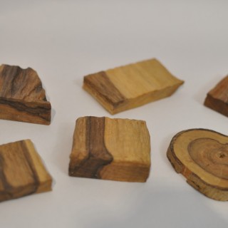 Silne magnesy neodymowe na lodówkę lub inne metalowe wyposażenie. Ręcznie dłutowane drewno orzechowe lub inne, konserwowane olejem, lakierem, woskiem. Kształty i rysunek przekroju drewna różne. Średnica 5-8 cm.