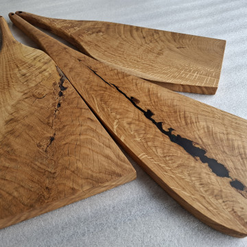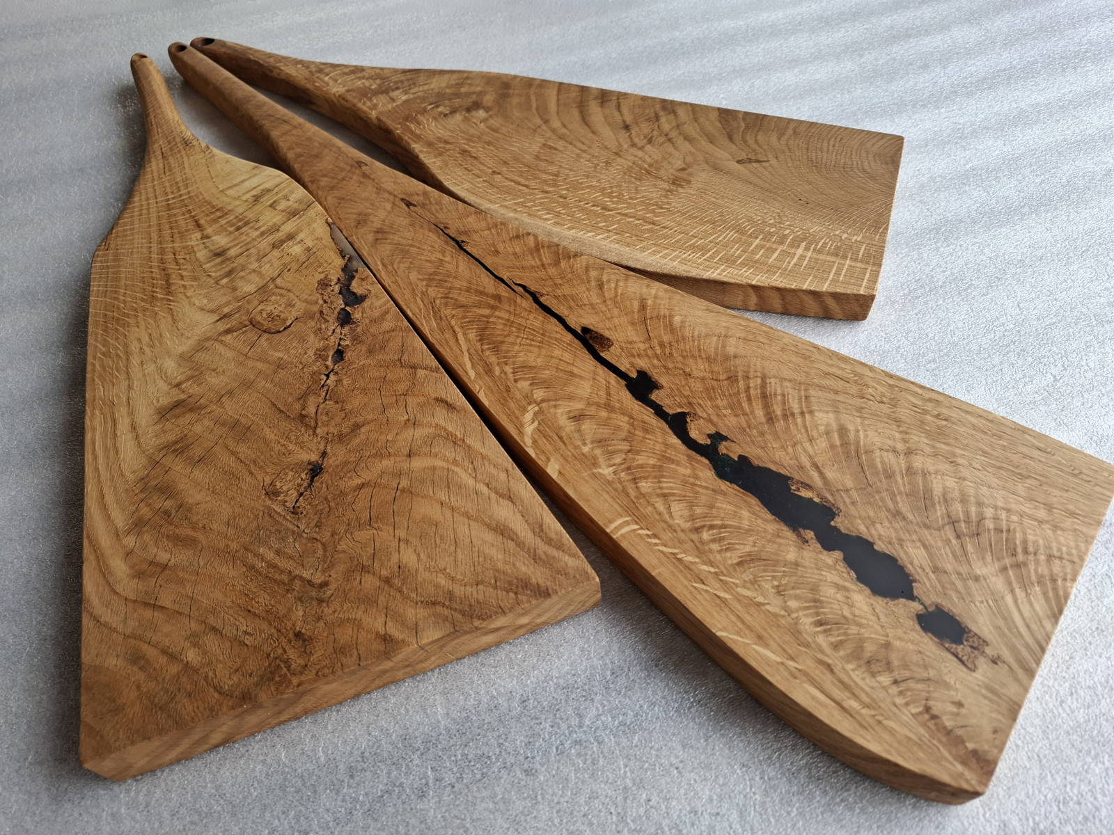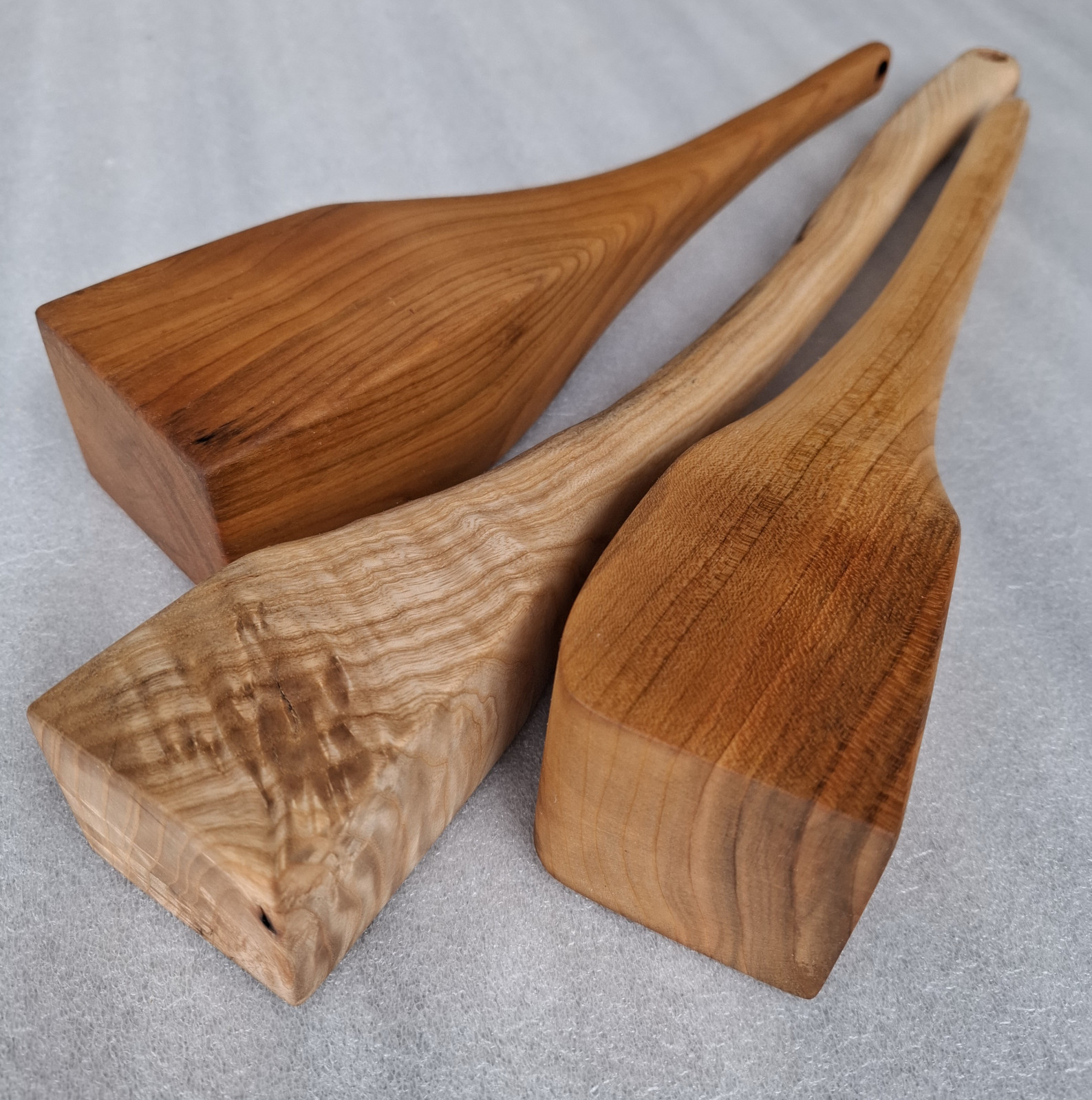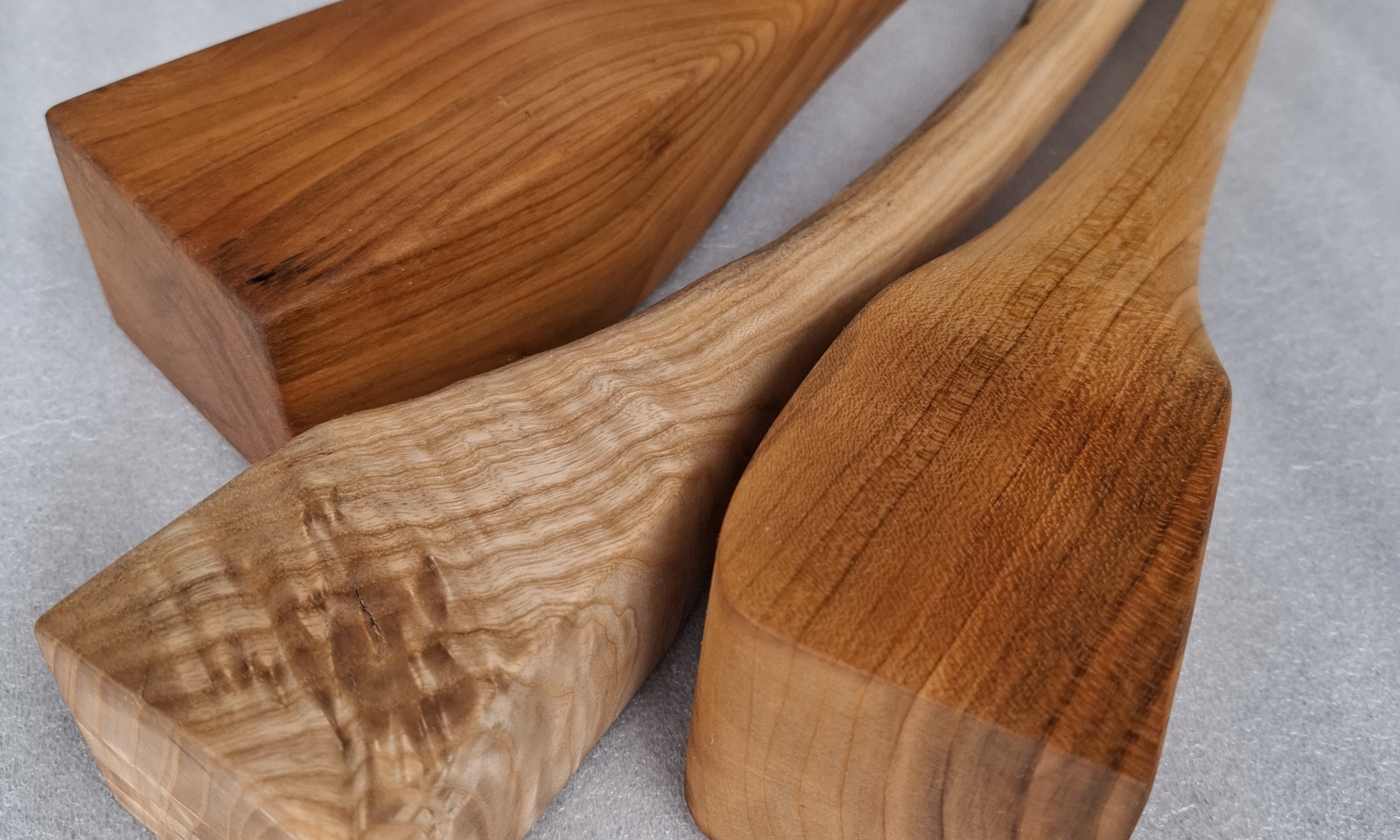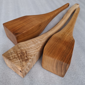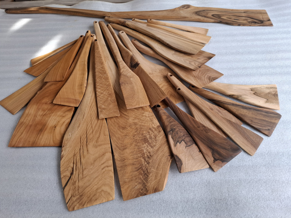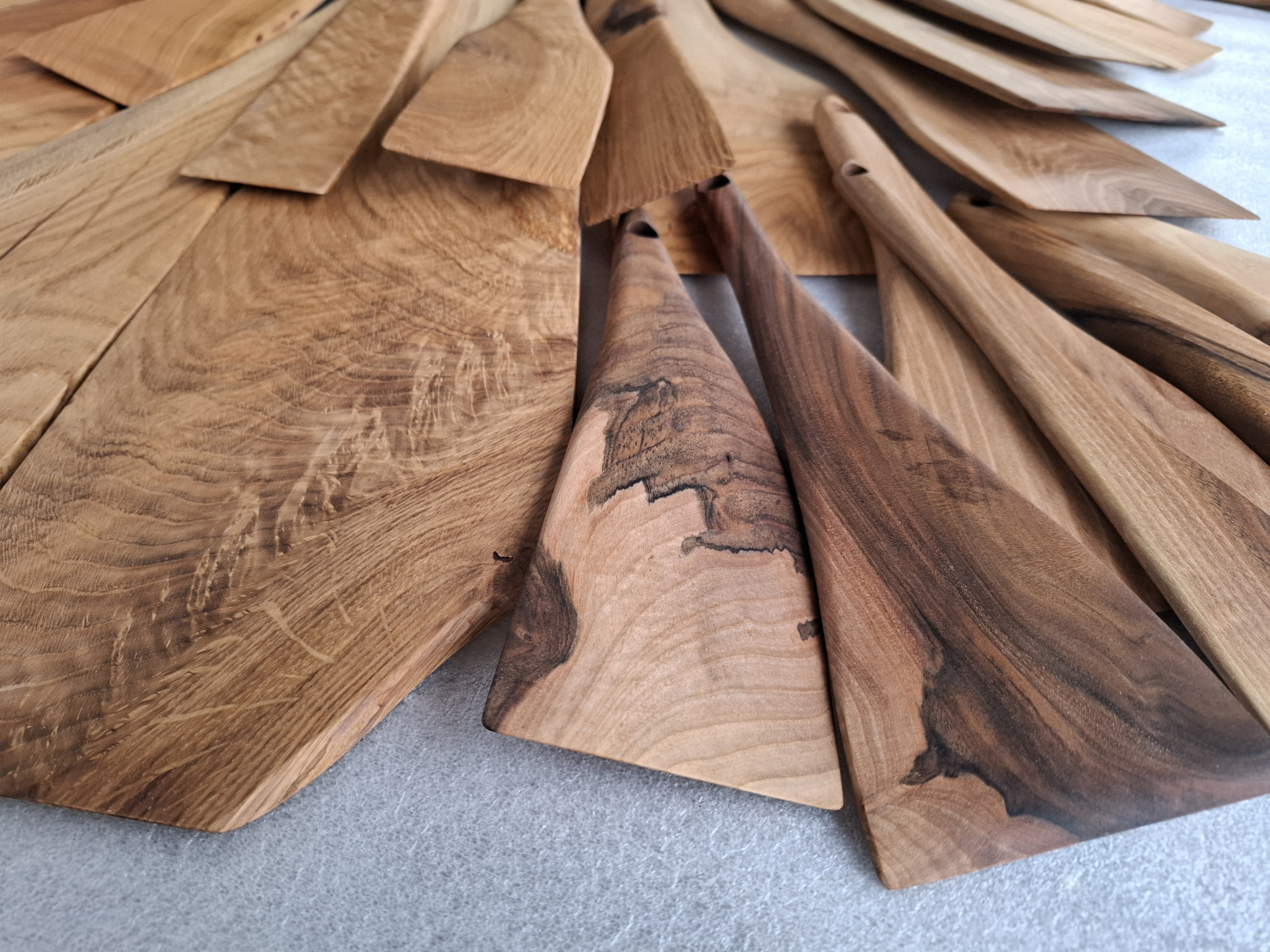 Nieduża partia drewnianych przyborów kuchennych, 25 łopatek kuchennych, 4 deski kuchenne i 3 tłuczki kuchenne. Wykonane z orzecha, dębu, jesionu i czereśni. Większość z kawałków drewna o ładnym falistym usłojeniu występującym na zrostach dwóch pni lub konarów, jest to tzw twardzica. Takie drewno jest kilkukrotnie twardsze i cięższe od standardowego ciężaru danego gatunku drewna