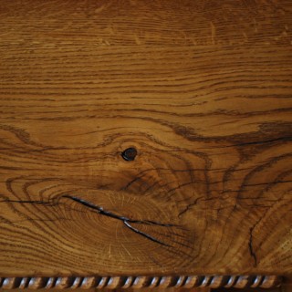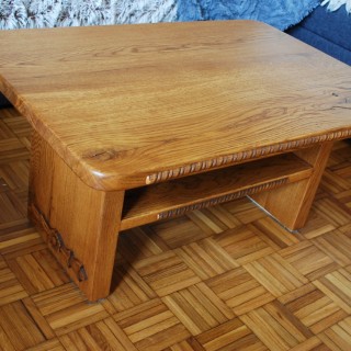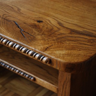 Ława dębowa z elementów grubości 30mm, z rzeźbionymi aplikacjami i półeczką pod blatem, barwiona na jasny brąz, lakierowana. Wymiary blatu 80x55cm, wysokość 40cm