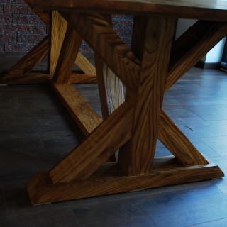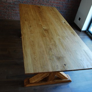 Masywny stół Dębowy z bali 10 x 10 cm, konstrukcja teowa z zastrzałami bocznymi i wzdłużnymi postarzana i szczotkowana, blat gładki. Wykończenie matowe w naturalnym kolorze. Wymiary blatu 200 x 90 cm.