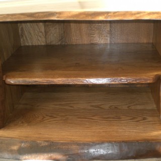 Szafka RTV z litego Jesionu (łącznie z tyłem), kanty, krawędzie i uchwyty samorodne, barwiona na dąb średni.