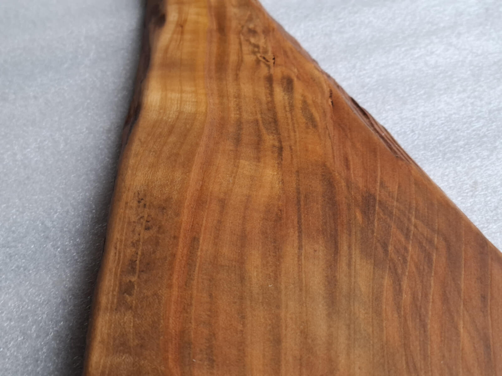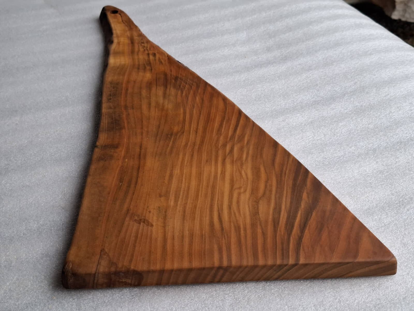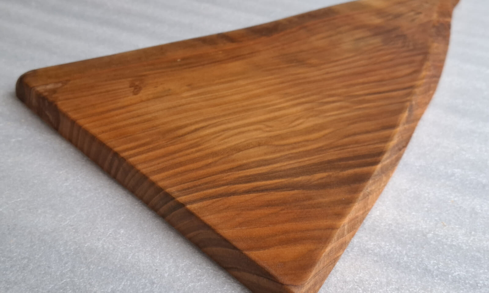 Deska Kuchenna z drewna Czereśni grubości 20 mm, kształt nieregularny trójkątny z rączką, krawędzie szczotkowane, nasączona naturalnym olejem lnianym.
