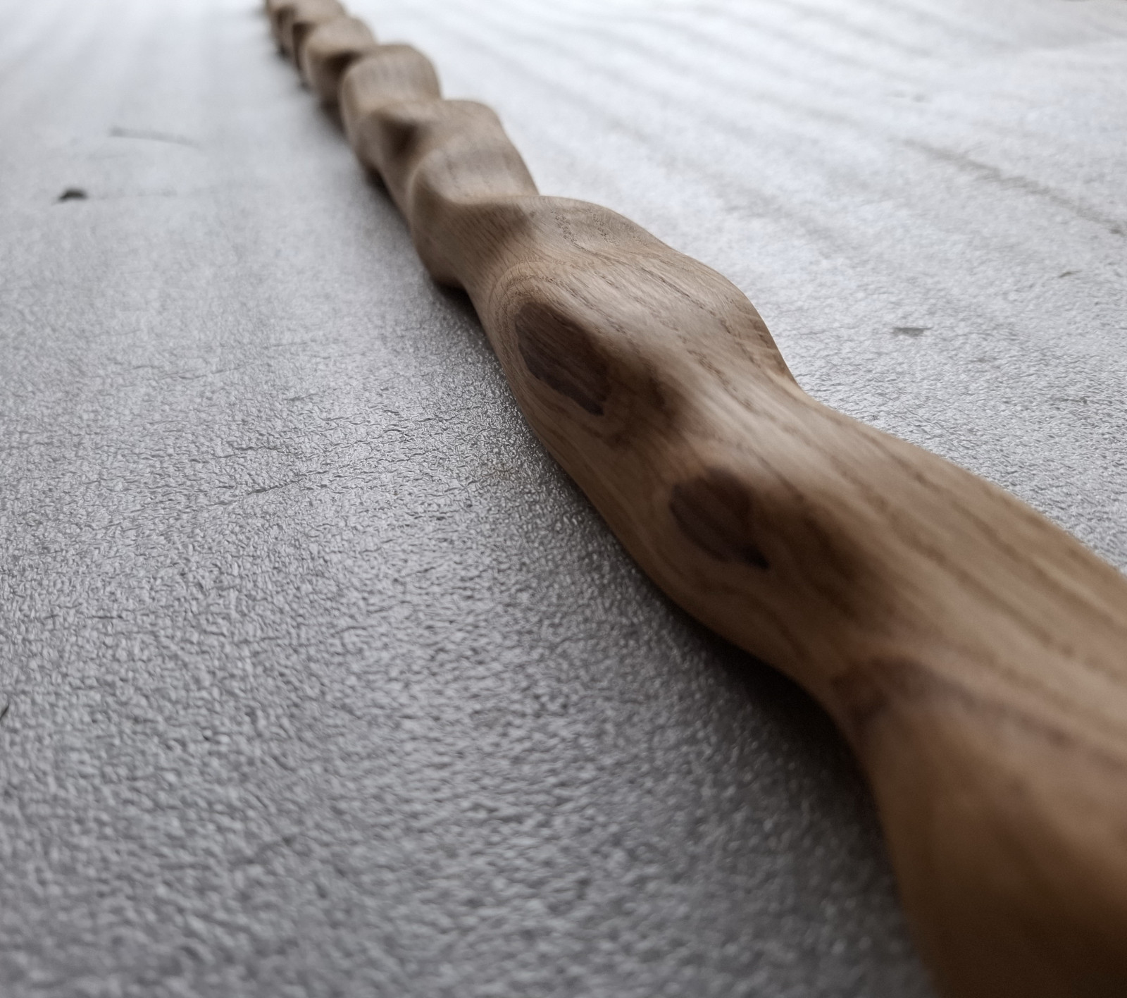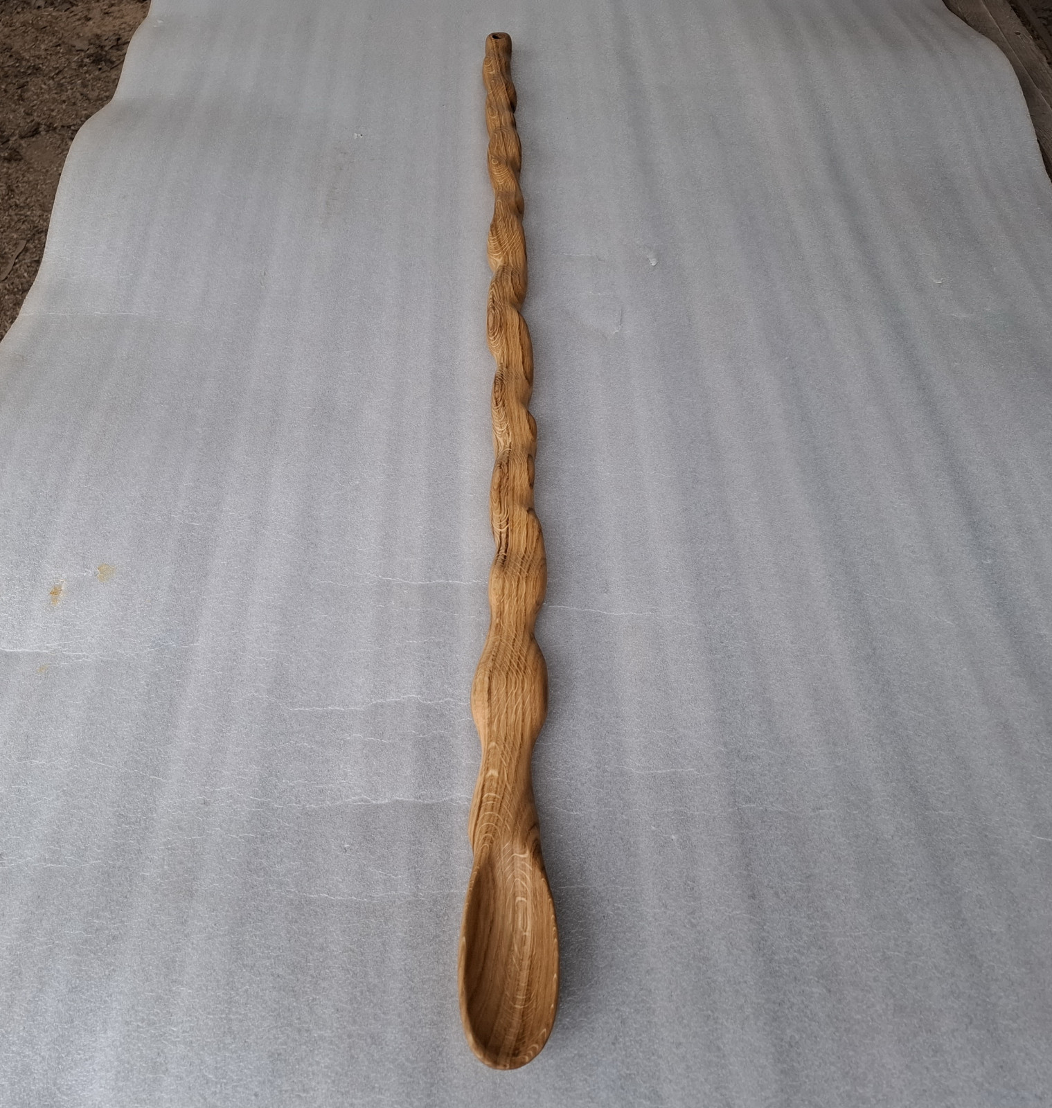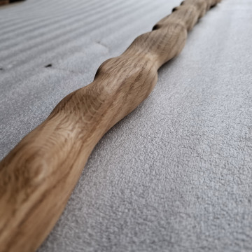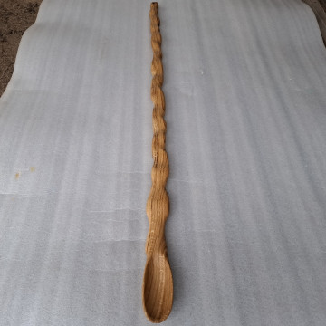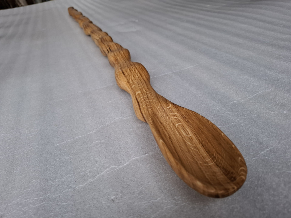 Łyżka rzeźbiona z drewna dębu, długa na 120cm i wąska, nasączona olejem lnianym.